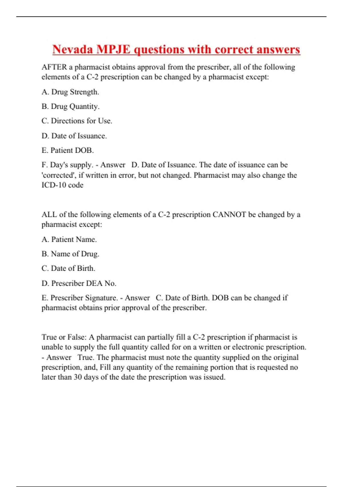 AFTER a pharmacist obtains approval from the prescriber, all of the following elements of a C-2 prescription can be changed by a pharmacist except: A. Drug Strength. B. Drug Quantity. C. Directions for Use. D. Date of Issuance. E. Patient DOB. F. Day's supply. - Answer D. Date of Issuance. The date of issuance can be 'corrected', if written in error, but not changed. Pharmacist may also change the ICD-10 code ALL of the following elements of a C-2 prescription CANNOT be changed by a pharmacist except: A. Patient Name. B. Name of Drug. C. Date of Birth. D. Prescriber DEA No. E. Prescriber Signature. - Answer C. Date of Birth. DOB can be changed if pharmacist obtains prior approval of the prescriber. True or False: A pharmacist can partially fill a C-2 prescription if pharmacist is unable to supply the full quantity called for on a written or electronic prescription. - Answer True. The pharmacist must note the quantity supplied on the original prescription, and, Fill any quantity of the remaining portion that is requested no later than 30 days of the date the prescription was issued.