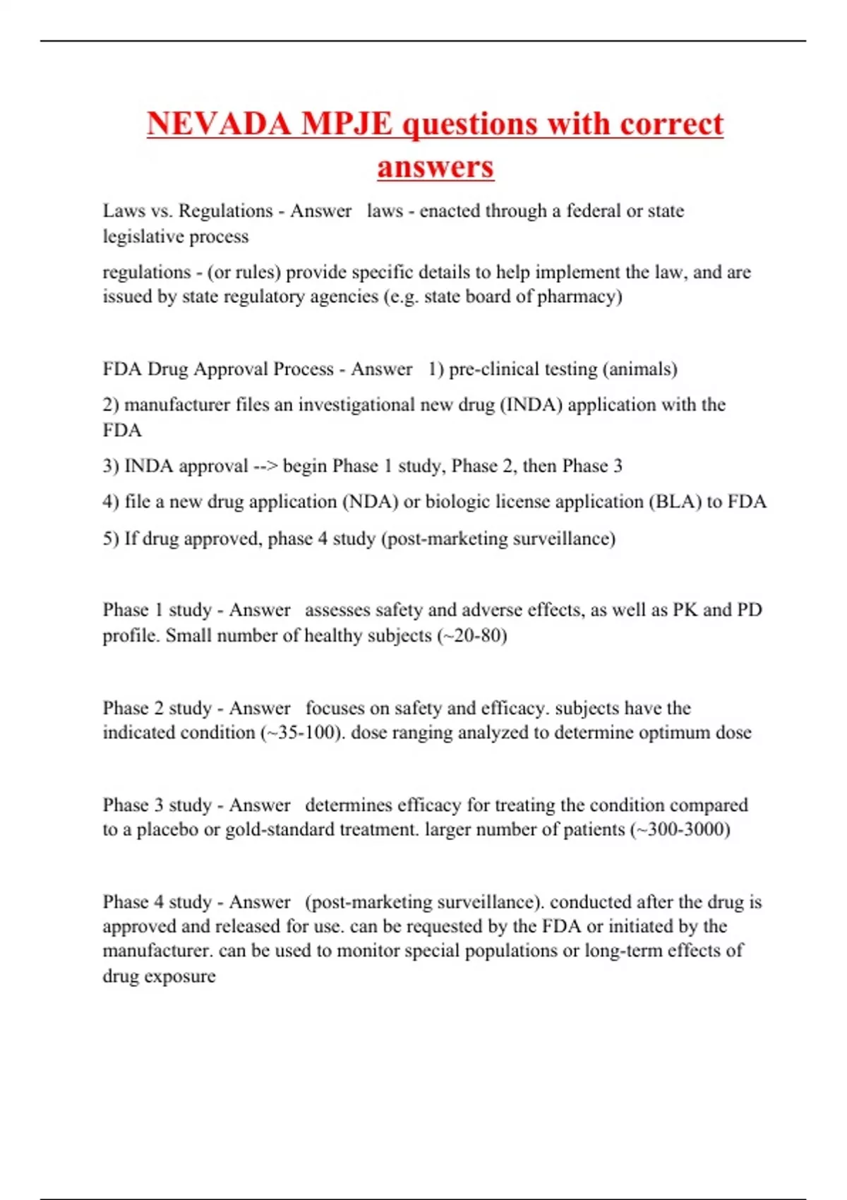Laws vs. Regulations - Answer laws - enacted through a federal or state legislative process regulations - (or rules) provide specific details to help implement the law, and are issued by state regulatory agencies (e.g. state board of pharmacy) FDA Drug Approval Process - Answer 1) pre-clinical testing (animals) 2) manufacturer files an investigational new drug (INDA) application with the FDA 3) INDA approval --> begin Phase 1 study, Phase 2, then Phase 3 4) file a new drug application (NDA) or biologic license application (BLA) to FDA 5) If drug approved, phase 4 study (post-marketing surveillance) Phase 1 study - Answer assesses safety and adverse effects, as well as PK and PD profile. Small number of healthy subjects (~20-80) Phase 2 study - Answer focuses on safety and efficacy. subjects have the indicated condition (~35-100). dose ranging analyzed to determine optimum dose Phase 3 study - Answer determines efficacy for treating the condition compared to a placebo or gold-standard treatment. larger number of patients (~300-3000) Phase 4 study - Answer (post-marketing surveillance). conducted after the drug is approved and released for use. can be requested by the FDA or initiated by the manufacturer. can be used to monitor special populations or long-term effects of drug exposure FDA Drug Approval Time - Answer - the NDA or BLA is evaluated by the FDA