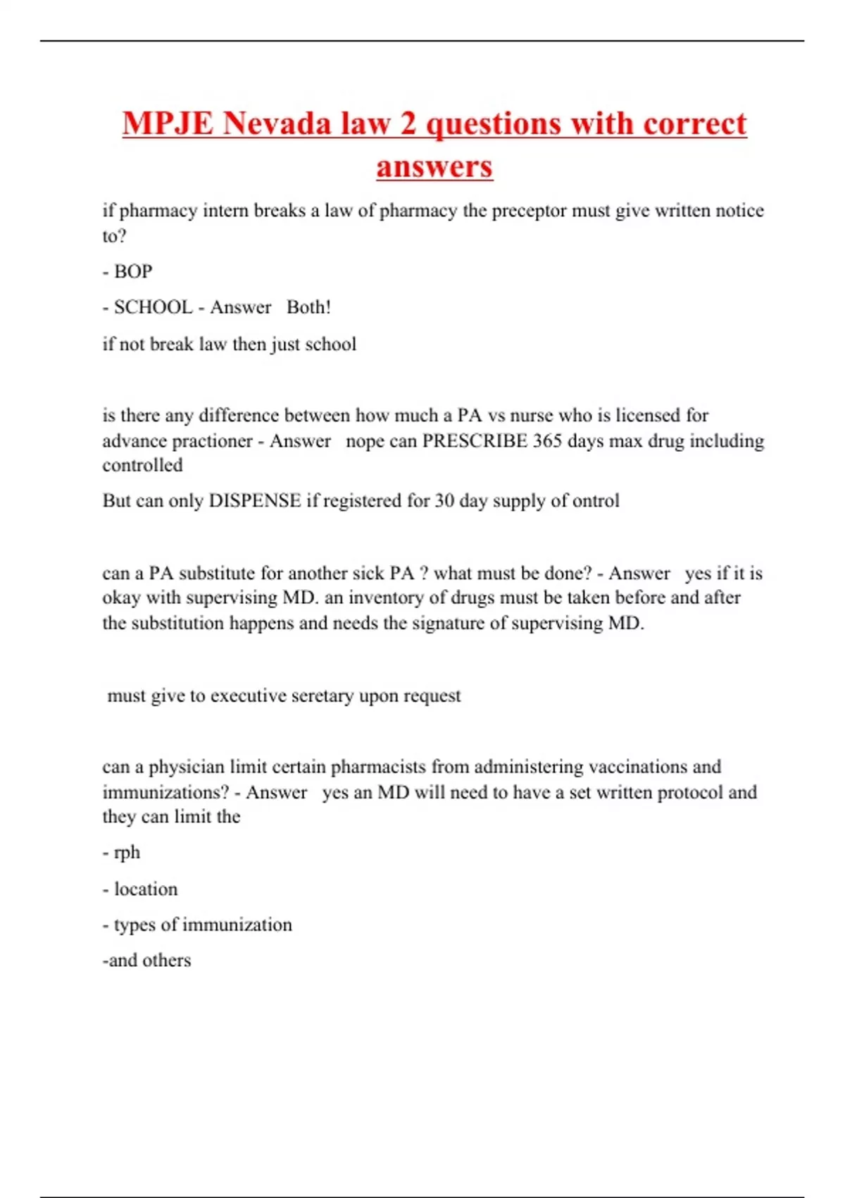 if pharmacy intern breaks a law of pharmacy the preceptor must give written notice to? - BOP - SCHOOL - Answer Both! if not break law then just school is there any difference between how much a PA vs nurse who is licensed for advance practioner - Answer nope can PRESCRIBE 365 days max drug including controlled But can only DISPENSE if registered for 30 day supply of ontrol can a PA substitute for another sick PA ? what must be done? - Answer yes if it is okay with supervising MD. an inventory of drugs must be taken before and after the substitution happens and needs the signature of supervising MD. must give to executive seretary upon request can a physician limit certain pharmacists from administering vaccinations and immunizations? - Answer yes an MD will need to have a set written protocol and they can limit the - rph - location - types of immunization -and others t/f the authorizing physician for immunization has to b