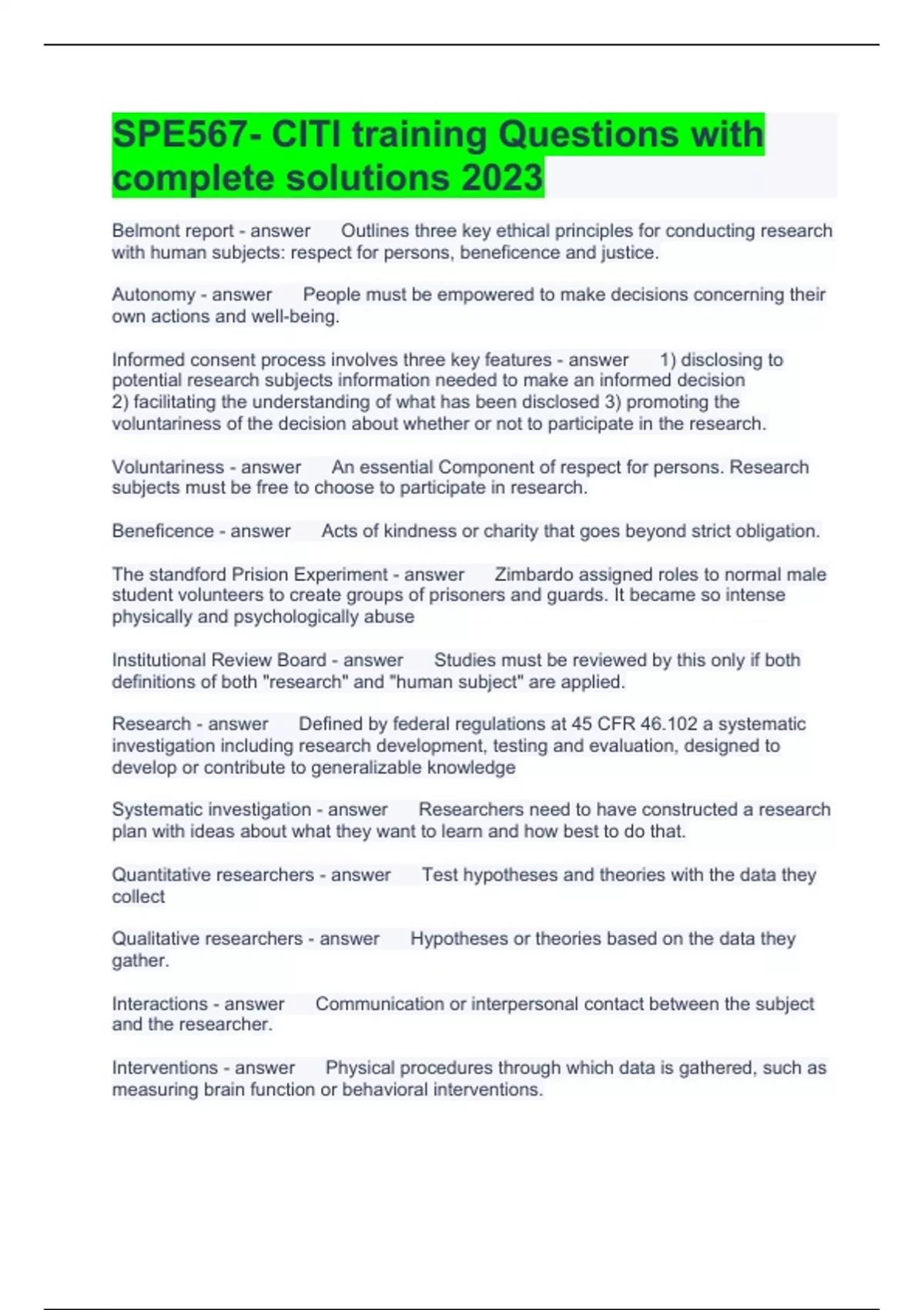 SPE567- CITI training Questions with complete solutions 2023 Belmont report Outlines three key ethical principles for conducting research with human subjects: respect for persons, beneficence and justice. Autonomy People must be empowered to make decisions concerning their own actions and well-being. Informed consent process involves three key features 1) disclosing to potential research subjects information needed to make an informed decision 2) facilitating the understanding of what has been disclosed 3) promoting the voluntariness of the decision about whether or not to participate in the research. Voluntariness An essential Component of respect for persons. Research subjects must be free to choose to participate in research. Beneficence Acts of kindness or charity that goes beyond strict obligation. The standford Prision Experiment Zimbardo assigned roles to normal male student volunteers to create groups of prisoners and guards. It became so intense physically and psychologically abuse Institutional Review Board Studies must be reviewed by this only if both definitions of both "research" and "human subject" are applied. Research Defined by federal regulations at 45 CFR 46.102 a systematic investigation including research development, testing and evaluation, designed to develop or contribute to generalizable knowledge Systematic investigation Researchers need to have constructed a research plan with ideas about what they want to learn and how best to do that. Quantitative researchers Test hypotheses and theories with the data they collect Qualitative researchers Hypotheses or theories based on the data they gather. Interactions Communication or interpersonal contact between the subject and the researcher. Interventions Physical procedures through which data is gathered, such as measuring brain function or behavioral interventions. Private information Information about bx that occurs in a context in which an individual can reasonably expect that no observation or recording is taking place. Family Education Rights and Privacy Act Protects the privacy of school records. Assurance Identifies the regulations for protecting research subjects that the institution will abide by and the ethical principles it will adopt. Expedited review Conducted by one or more experienced IRB members. Cant pose no more than minimal risk to subjects. And consist of only one or more research activities specified regulations as eligible for expedited review. 3 types of reviewers -Individuals identified by the instituation to screen research for exempt status. -One or more experienced IRB members conducting expedited reviews. -Members of convened IRB for studies requiring IRB review. IRB review committee established to ensure that the rights and welfare of human research subjects are protected. IRB requirements: Must have at least 5 members, must be diverse, including considerations of race, gender and cultural background. The most important requirement is that an IRB must have the expertise and professional competence to evaluate the research it reviews. Exempt Research When research is exempt from the provisions of the Common Rule, it follows that the review criteria provided for expedited and IRB review would not apply. All Research should abide by the three basic ethical principles: Respect for persons, beneficence and justice. Federal regulations permit: Expedited review procedures to be used for continuing review if the initial review was expedited and no new risks were identified. Challenging task researches and IRB face: -Identifying and evaluating risks of harm associated with participation in research. Risk of harm in social and behavioral sciences generally fall into three categories: -Invasion of privacy -breach of confidentiality -study procedures Two probabilities of Harm: - The likelihood that a specific harm might occur -magnitude or severity of harm should it occur. Certificates of Confidentiality Are used by the national Institutes if Health (NIH) to protect identifiable research information from compelled disclosure There are two parts to informed consent: ding information to prospective subjects 2. documentation that the process took place and is a record of the subjects' agreement to take part in the study. Informed Consent A process that begins with the recruitment and screening of a subject and continues throughout the subjects involvement in the research. Minimal risk The probability and magnitude of harm or discomfort anticipated in the research are not greater in and of themselves than those ordinarily encountered in the daily life or during the performance of routine physical or psychological examination Impracticable It means that securing consent is not feasible, regardless of cost and time. Deception Outright deception can sometimes be justified as essential for investigating a particular phenomenon Complete Non-Disclosure If people know that they are being observed, they may alter their behavior in such a way that obtaining meaningful results is not possible. When is the documentation of consent waived: The principal risks are those associated with a breach of confidentiality concerning the subject's participation in the research. And when study participation presents minimal risk of harm to subject and the research involves no procedures requiring consent outside the context of participation in a research study. Privacy Having control over the extent, timing and circumstances of sharing oneself with others Confidentiality The treatment of information that an individual has disclosed in a relationship of trust and with the expectation that it will not be divulged to others, in ways that are inconsistent with the understanding of the original disclosure without permission. Reasonable assumptions regarding privacy will vary from culture to culture and setting to setting. Snowball sampling Recruitment technique in which research participants are asked to assist researchers in identify