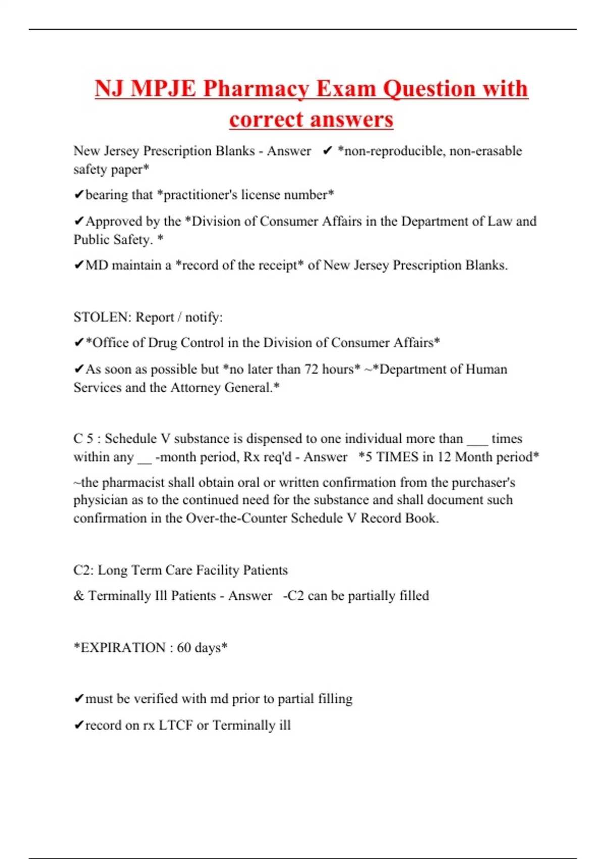 New Jersey Prescription Blanks - Answer *non-reproducible, non-erasable safety paper* bearing that *practitioner's license number* Approved by the *Division of Consumer Affairs in the Department of Law and Public Safety. * MD maintain a *record of the receipt* of New Jersey Prescription Blanks. STOLEN: Report / notify: *Office of Drug Control in the Division of Consumer Affairs* As soon as possible but *no later than 72 hours* ~*Department of Human Services and the Attorney General.* C 5 : Schedule V substance is dispensed to one individual more than ___ times within any __ -month period, Rx req'd - Answer *5 TIMES in 12 Month period* ~the pharmacist shall obtain oral or written confirmation from the purchaser's physician as to the continued need for the substance and shall document such confirmation in the Over-the-Counter Schedule V Record Book. C2: Long Term Care Facility Patients & Terminally Ill Patients - Answer -C2 can be partially filled *EXPIRATION : 60 days* must be verified with md prior to partial filling