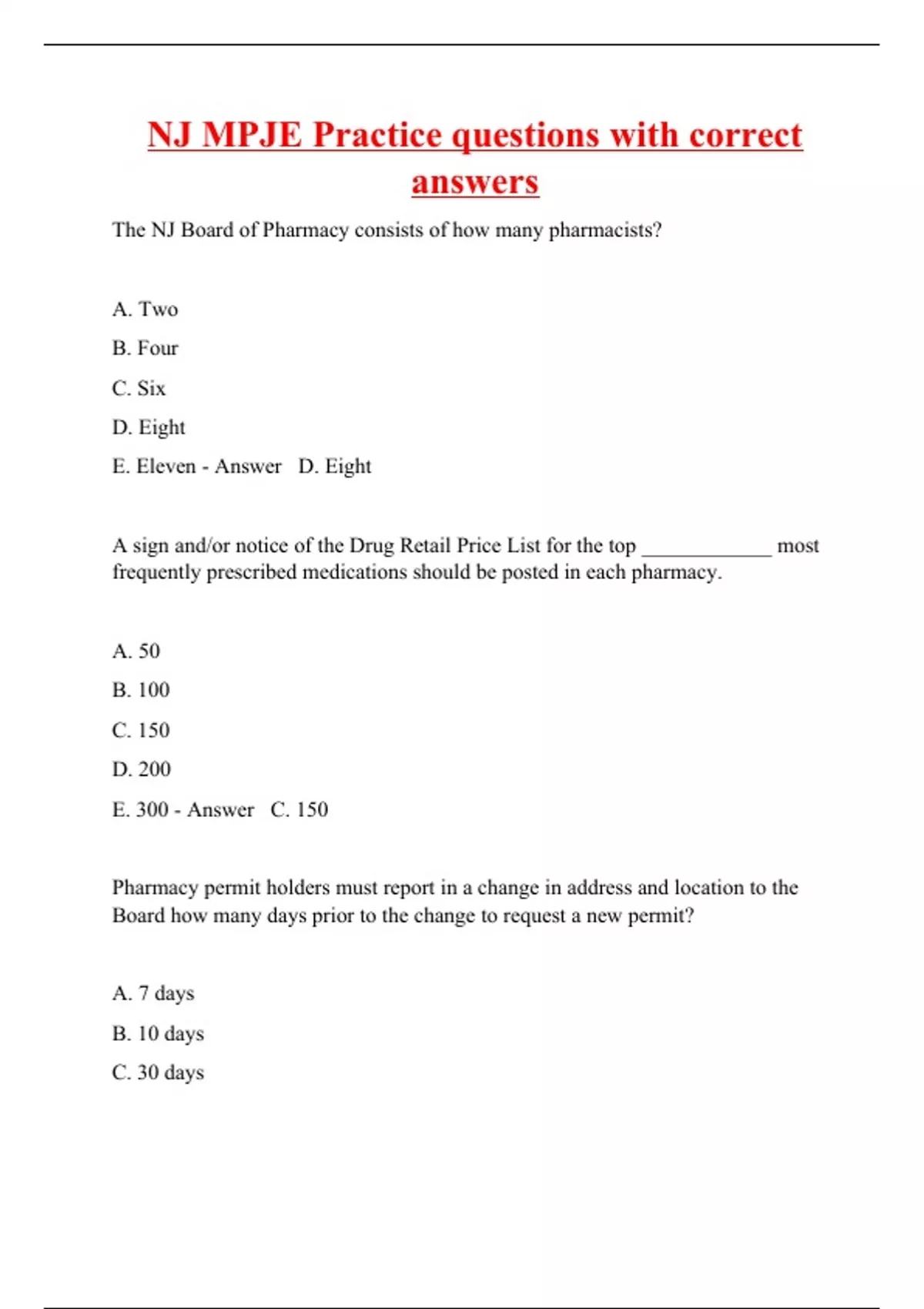 The NJ Board of Pharmacy consists of how many pharmacists? A. Two B. Four C. Six D. Eight E. Eleven - Answer D. Eight A sign and/or notice of the Drug Retail Price List for the top ____________ most frequently prescribed medications should be posted in each pharmacy. A. 50 B. 100 C. 150 D. 200 E. 300 - Answer C. 150 Pharmacy permit holders must report in a change in address and location to the Board how many days prior to the change to request a new permit? A. 7 days B. 10 days C. 30 days