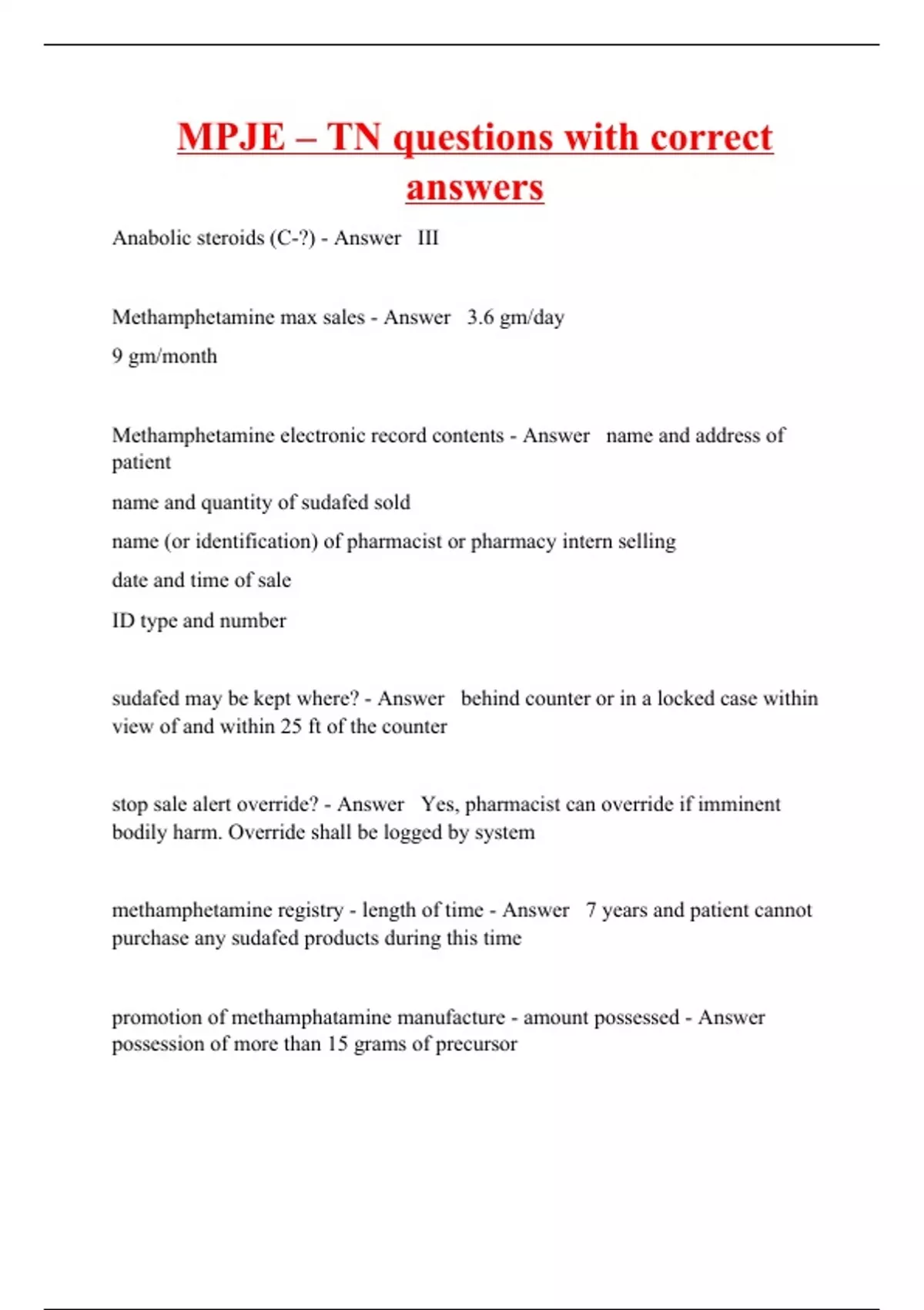 Anabolic steroids (C-?) - Answer III Methamphetamine max sales - Answer 3.6 gm/day 9 gm/month Methamphetamine electronic record contents - Answer name and address of patient name and quantity of sudafed sold name (or identification) of pharmacist or pharmacy intern selling date and time of sale ID type and number sudafed may be kept where? - Answer behind counter or in a locked case within view of and within 25 ft of the counter stop sale alert override? - Answer Yes, pharmacist can override if imminent bodily harm. Override shall be logged by system methamphetamine registry - length of time - Answer 7 years and patient cannot purchase any sudafed products during this time promotion of methamphatamine manufacture - amount possessed - Answer possession of more than 15 grams of precursor