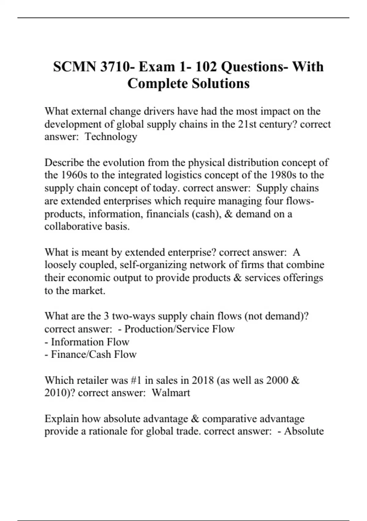 What external change drivers have had the most impact on the development of global supply chains in the 21st century? correct answer: Technology Describe the evolution from the physical distribution concept of the 1960s to the integrated logistics concept of the 1980s to the supply chain concept of today. correct answer: Supply chains are extended enterprises which require managing four flows- products, information, financials (cash), & demand on a collaborative basis. What is meant by extended enterprise? correct answer: A loosely coupled, self-organizing network of firms that combine their economic output to provide products & services offerings to the market. What are the 3 two-ways supply chain flows (not demand)? correct answer: - Production/Service Flow - Information Flow - Finance/Cash Flow Which retailer was #1 in sales in 2018 (as well as 2000 & 2010)? correct answer: Walmart Explain how absolute advantage & comparative advantage provide a rationale for global trade. correct answer: - Absolute Advantage: Lower cost &/or access to items not available locally. - Comparative Advantage: Differences in the cost of producing products in different countries. What is the most populous country in the world & which one is expected to be the most populous by 2050? correct answer: China & then India What is a megacity? correct answer: A very large city, typically one with over a population of over 10 million people.