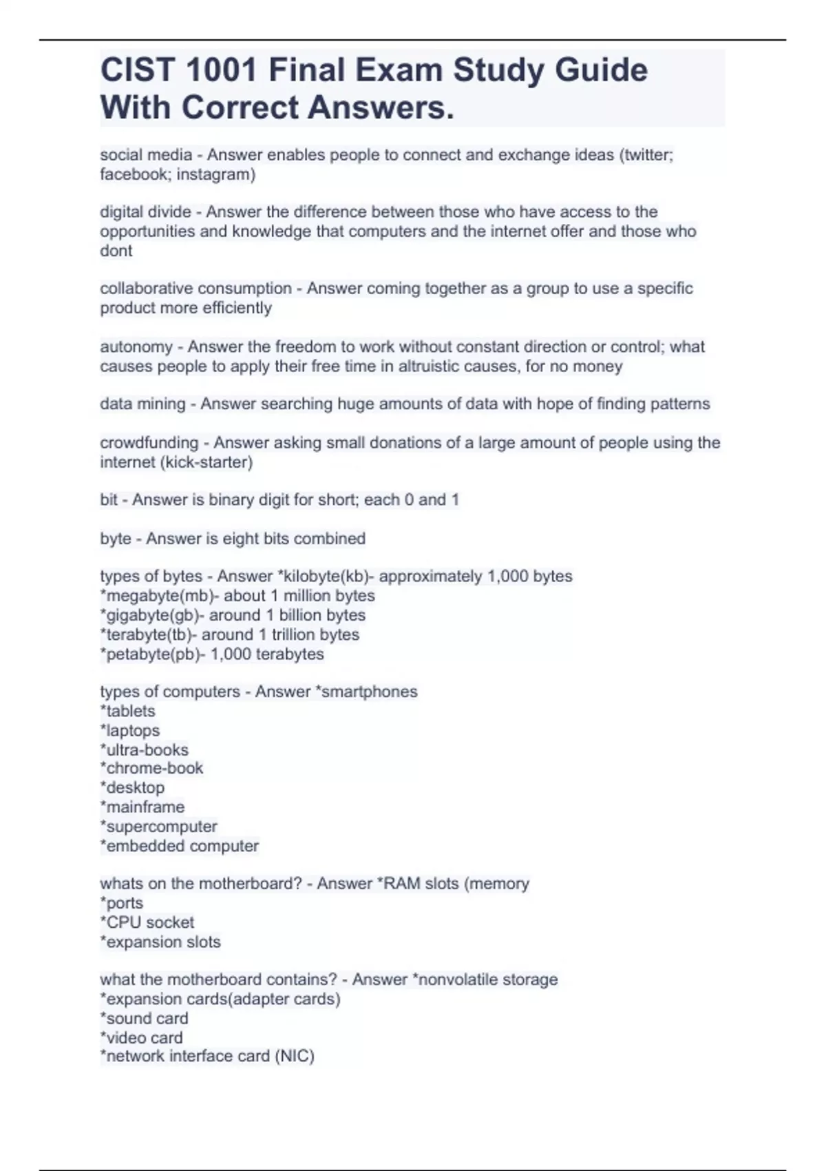 CIST 1001 Final Exam Study Guide With Correct Answers.