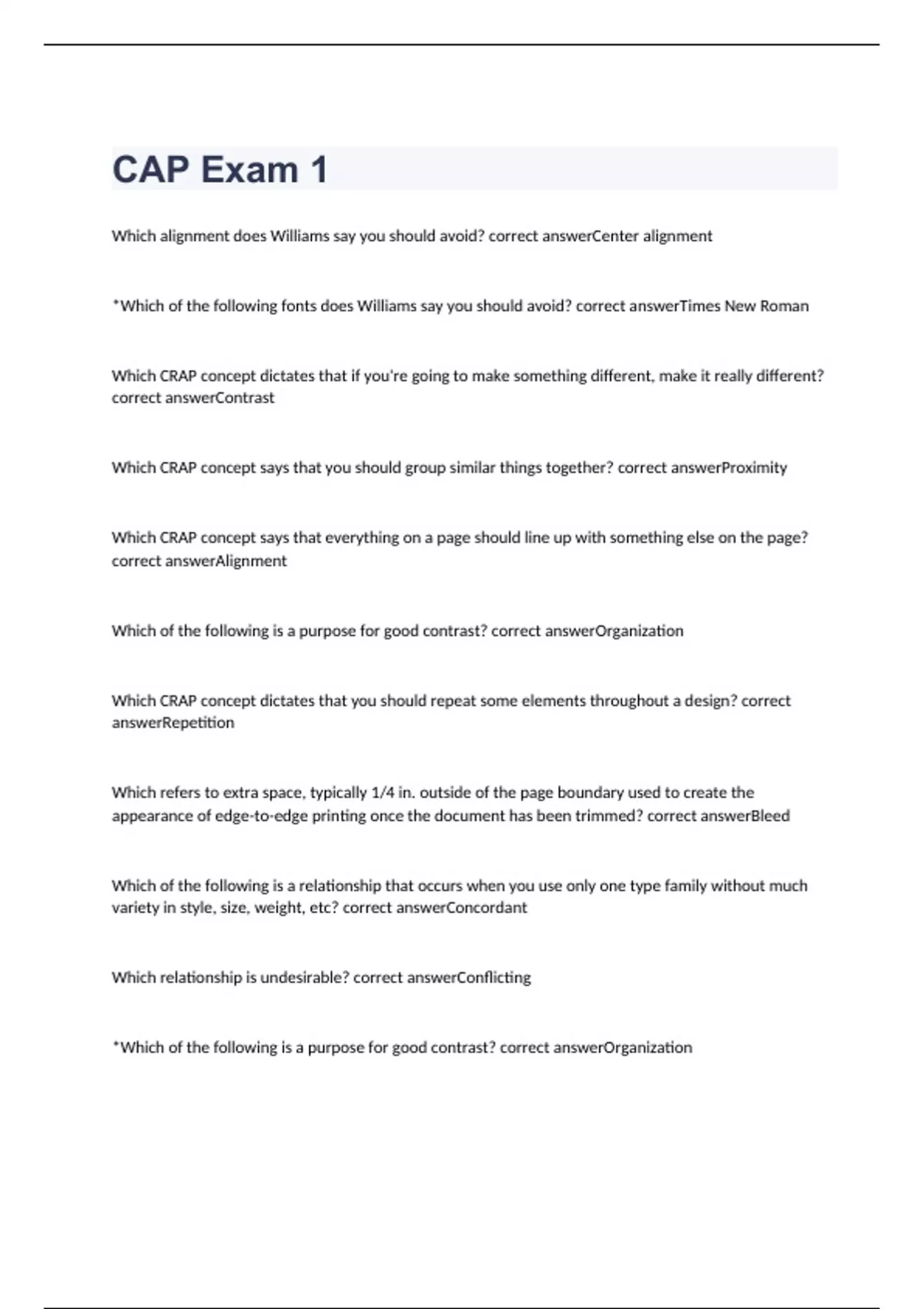Which alignment does Williams say you should avoid? Center alignment *Which of the following fonts does Williams say you should avoid? Times New Roman Which CRAP concept dictates that if you're going to make something different, make it really different? Contrast Which CRAP concept says that you should group similar things together? Proximity Which CRAP concept says that everything on a page should line up with something else on the page? Alignment Which of the following is a purpose for good contrast? Organization Which CRAP concept dictates that you should repeat some elements throughout a design? Repetition Which refers to extra space, typically 1/4 in. outside of the page boundary used to create the appearance of edge-to-edge printing once the document has been trimmed? Bleed Which of the following is a relationship that occurs when you use only one type family without much variety in style, size, weight, etc? Concordant Which relationship is undesirable? Conflicting *Which of the following is a purpose for good contrast? Organization *Which relationship tends to be calm and formal? Concordant Which of the following is a relationship that occurs when you combine separate typefaces and elements that are clearly distinct from each other? Contrasting
