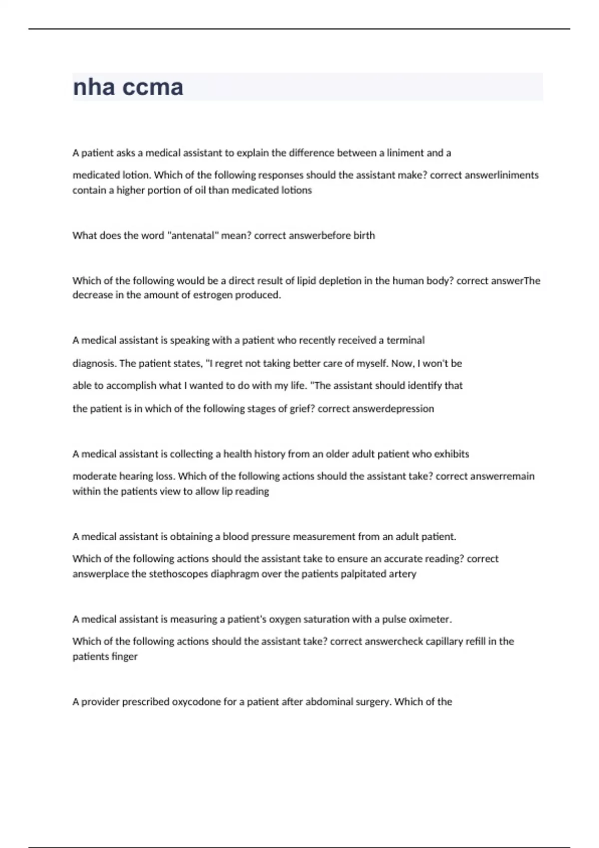 A patient asks a medical assistant to explain the difference between a liniment and a medicated lotion. Which of the following responses should the assistant make? liniments contain a higher portion of oil than medicated lotions What does the word "antenatal" mean? before birth Which of the following would be a direct result of lipid depletion in the human body? The decrease in the amount of estrogen produced. A medical assistant is speaking with a patient who recently received a terminal diagnosis. The patient states, "I regret not taking better care of myself. Now, I won't be able to accomplish what I wanted to do with my life. "The assistant should identify that the patient is in which of the following stages of grief? depression A medical assistant is collecting a health history from an older adult patient who exhibits moderate hearing loss. Which of the following actions should the assistant take? remain within the patients view to allow lip reading A medical assistant is obtaining a blood pressure measurement from an adult patient. Which of the following actions should the assistant take to ensure an accurate reading? place the stethoscopes diaphragm over the patients palpitated artery A medical assistant is measuring a patient's oxygen saturation with a pulse oximeter. Which of the following actions should the assistant take? check capillary refill in the patients finger A provider prescribed oxycodone for a patient after abdominal surgery. Which of the following described this type of medication? oxycodone is a schedule 2 controlled substance and has a high potential for abuse A medical assistant is preparing to assist a provider with suturing a wound. Which of the following items should be in the sterile field for this procedure? hemostat A medical assistant is preparing a patient who has a bilateral below-the-knee amputations for an EKG. Which of the following sites should the assistant select for the electrode placement? abdomen