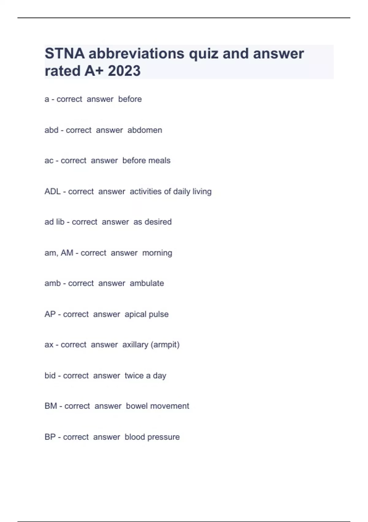 STNA abbreviations quiz and answer rated A+ 2023a - correct answer before abd - correct answer abdomen ac - correct answer before meals ADL - correct answer activities of daily living ad lib - correct answer as desired am, AM - correct answer morning amb - correct answer ambulate AP - correct answer apical pulse ax - correct answer axillary (armpit) bid - correct answer twice a day BM - correct answer bowel movement BP - correct answer blood pressure