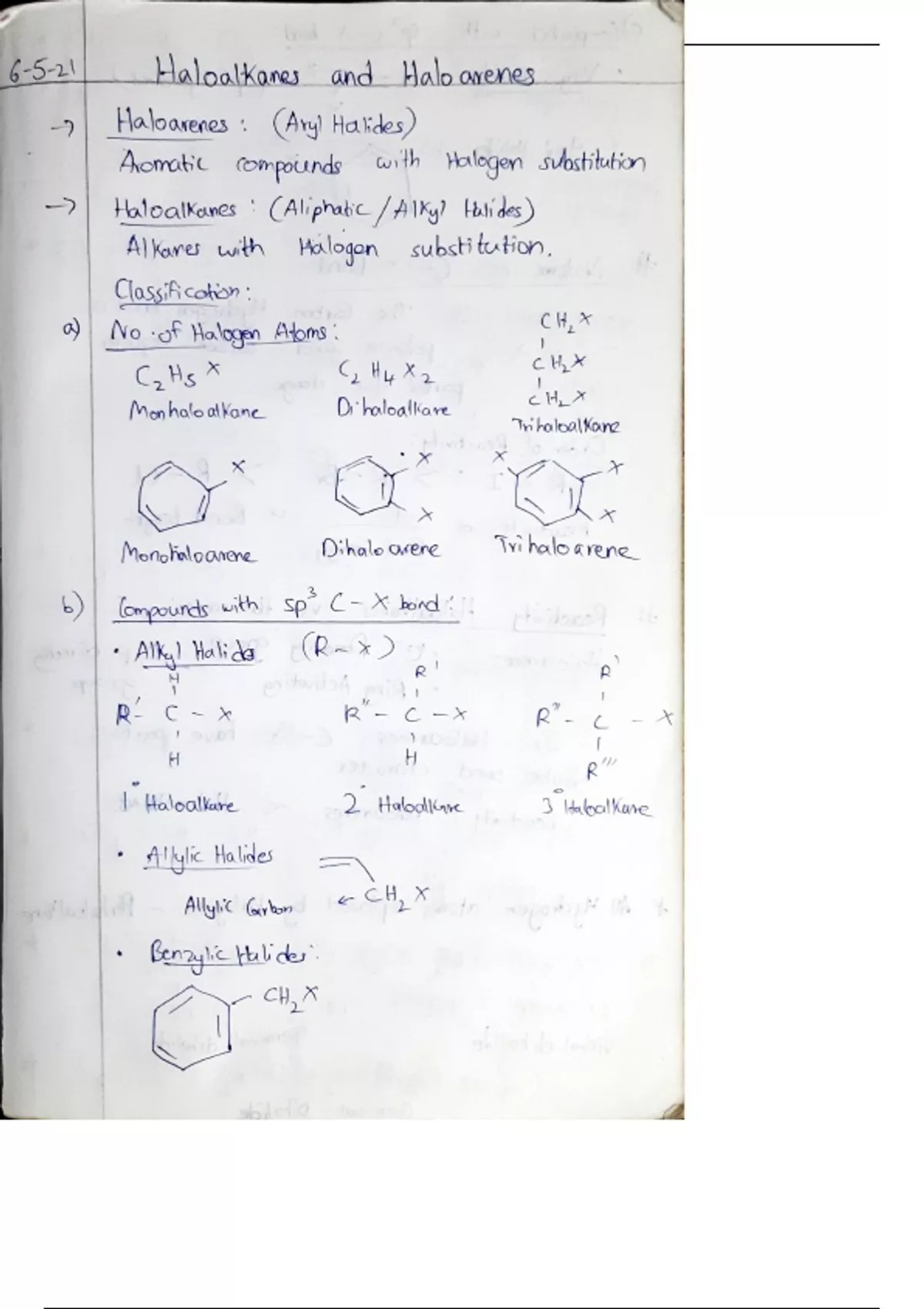 Detailed handwritten notes covering properties preparation compounds of organic compounds containing halogens