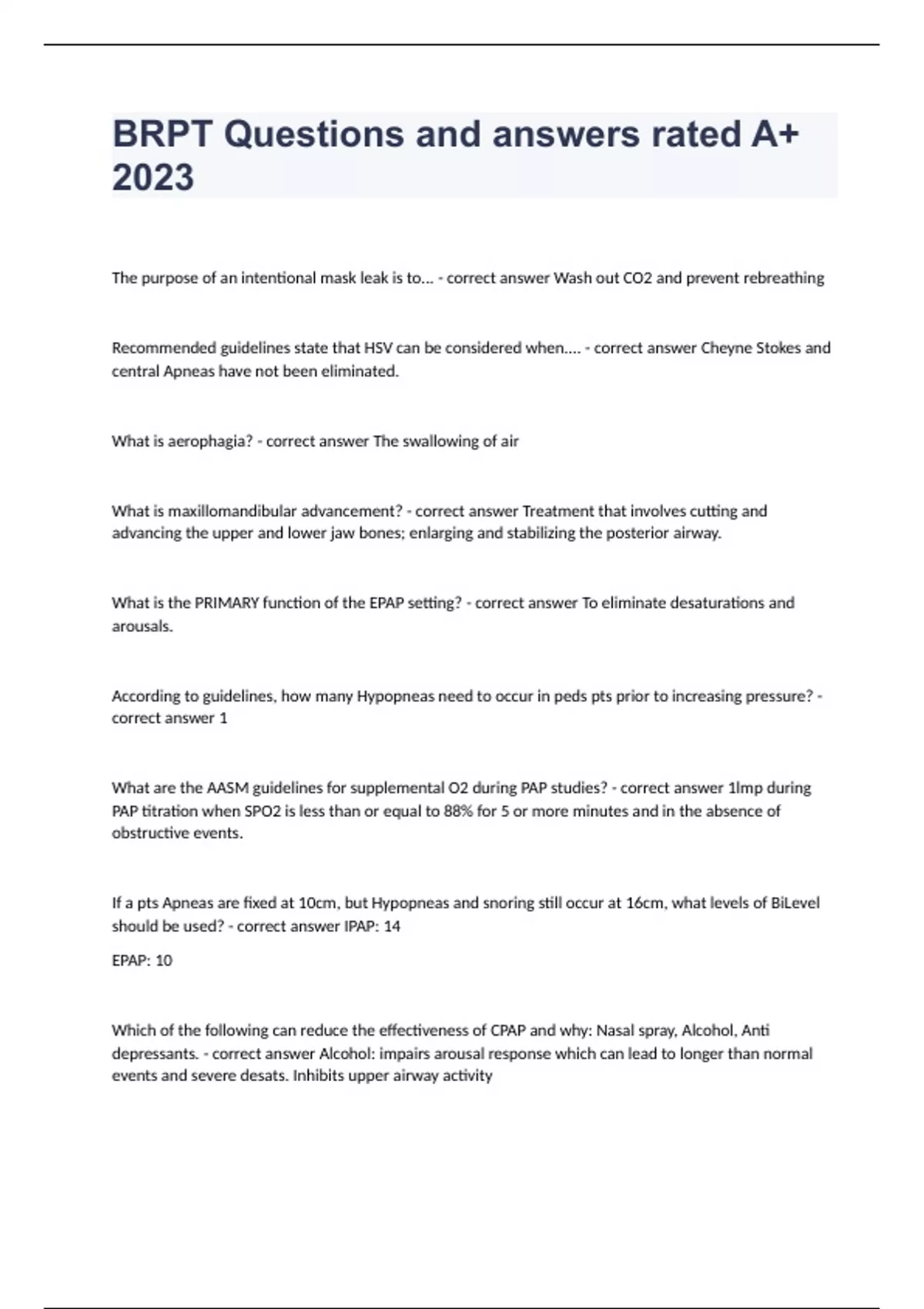 BRPT Questions and answers rated A+ 2023The purpose of an intentional mask leak is to... - correct answer Wash out CO2 and prevent rebreathing Recommended guidelines state that HSV can be considered when.... - correct answer Cheyne Stokes and central Apneas have not been eliminated. What is aerophagia? - correct answer The swallowing of air What is maxillomandibular advancement? - correct answer Treatment that involves cutting and advancing the upper and lower jaw bones; enlarging and stabilizing the posterior airway. What is the PRIMARY function of the EPAP setting? - correct answer To eliminate desaturations and arousals. According to guidelines, how many Hypopneas need to occur in peds pts prior to increasing pressure? - correct answer 1 What are the AASM guidelines for supplemental O2 during PAP studies? - correct answer 1lmp during PAP titration when SPO2 is less than or equal to 88% for 5 or more minutes and in the absence of obstructive events. If a pts Apneas are fixed at 10cm, but Hypopneas and snoring still occur at 16cm, what levels of BiLevel should be used? - correct answer IPAP: 14 EPAP: 10 Which of the following can reduce the effectiveness of CPAP and why: Nasal spray, Alcohol, Anti depressants. - correct answer Alcohol: impairs arousal response which can lead to longer than normal events and severe desats. Inhibits upper airway activity