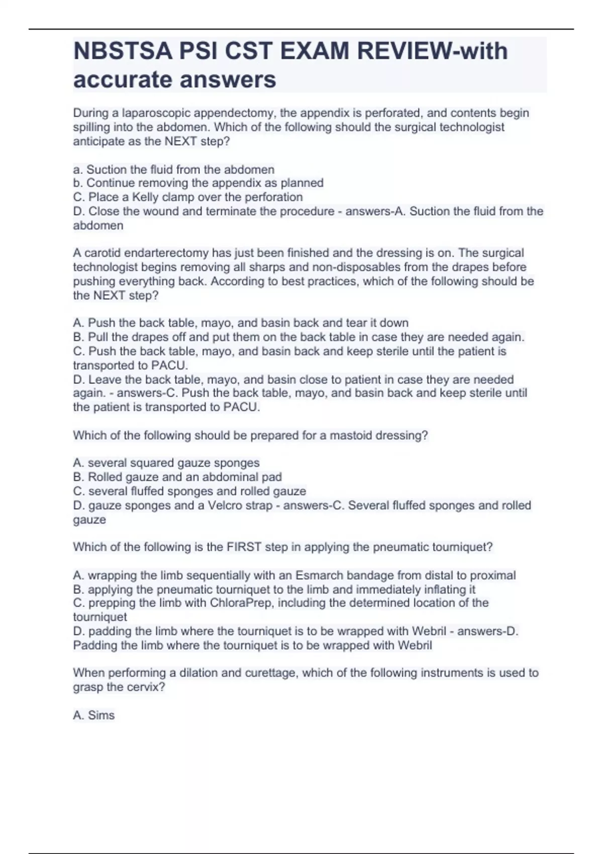Apart B. suction tip C. pulse lavage D. endocatch bag - answers-A. Smoke evacuator from trauma cases, which of the following incisions would be BEST for sigmoid surgery? A. vertical midline B. vertical paramedian C. oblique subcostal D. lower transverse - answers-B. Vertical paramedian The kidneys help regulate the blood levels of several ions, including A. bicarbonate, water, and protein. B. protein, sodium, and bicarbonate. C. potassium, protein, and sodium. D. sodium, potassium, and calcium. - answers-D. Sodium, potassium, and calcium Which of the following is the MOST effective mechanical method of controlling bleeding occurring from needle holes in vessel anastomoses? A. pledget B. suction C. ligature D. clamp - answers-A. pledget Which of the following tags indicates the least critical of patients in a triage situation? A. yellow B. black C. red D. green - answers-D. green