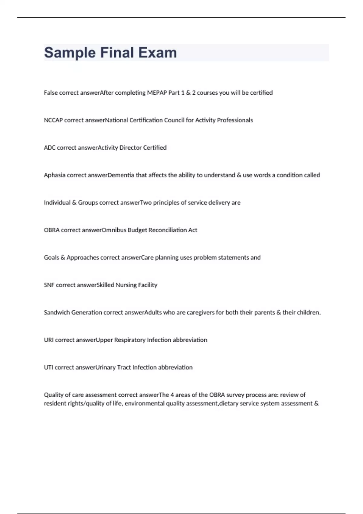 False After completing MEPAP Part 1 & 2 courses you will be certified NCCAP National Certification Council for Activity Professionals ADC Activity Director Certified Aphasia Dementia that affects the ability to understand & use words a condition called Individual & Groups Two principles of service delivery are OBRA Omnibus Budget Reconciliation Act Goals & Approaches Care planning uses problem statements and SNF Skilled Nursing Facility Sandwich Generation Adults who are caregivers for both their parents & their children. URI Upper Respiratory Infection abbreviation UTI Urinary Tract Infection abbreviation Quality of care assessment The 4 areas of the OBRA survey process are: review of resident rights/quality of life, environmental quality assessment,dietary service system assessment & Cohort A generational group as defined by demographics, statistics historical events or research is called a Measurable & Obtainable Care planning goals should be FTAg 248 Activity Program Regulation FTag 249 Activity Director Qualifications Population Assessment The information from individual resident assessments compiled & used to specify the composition groups based on interests 483.15(f) The facility must provide an ongoing program of activities designed to meet, in accordance with the comprehensive assessment, the interests & the physical, mental, psychosocial well being of each resident