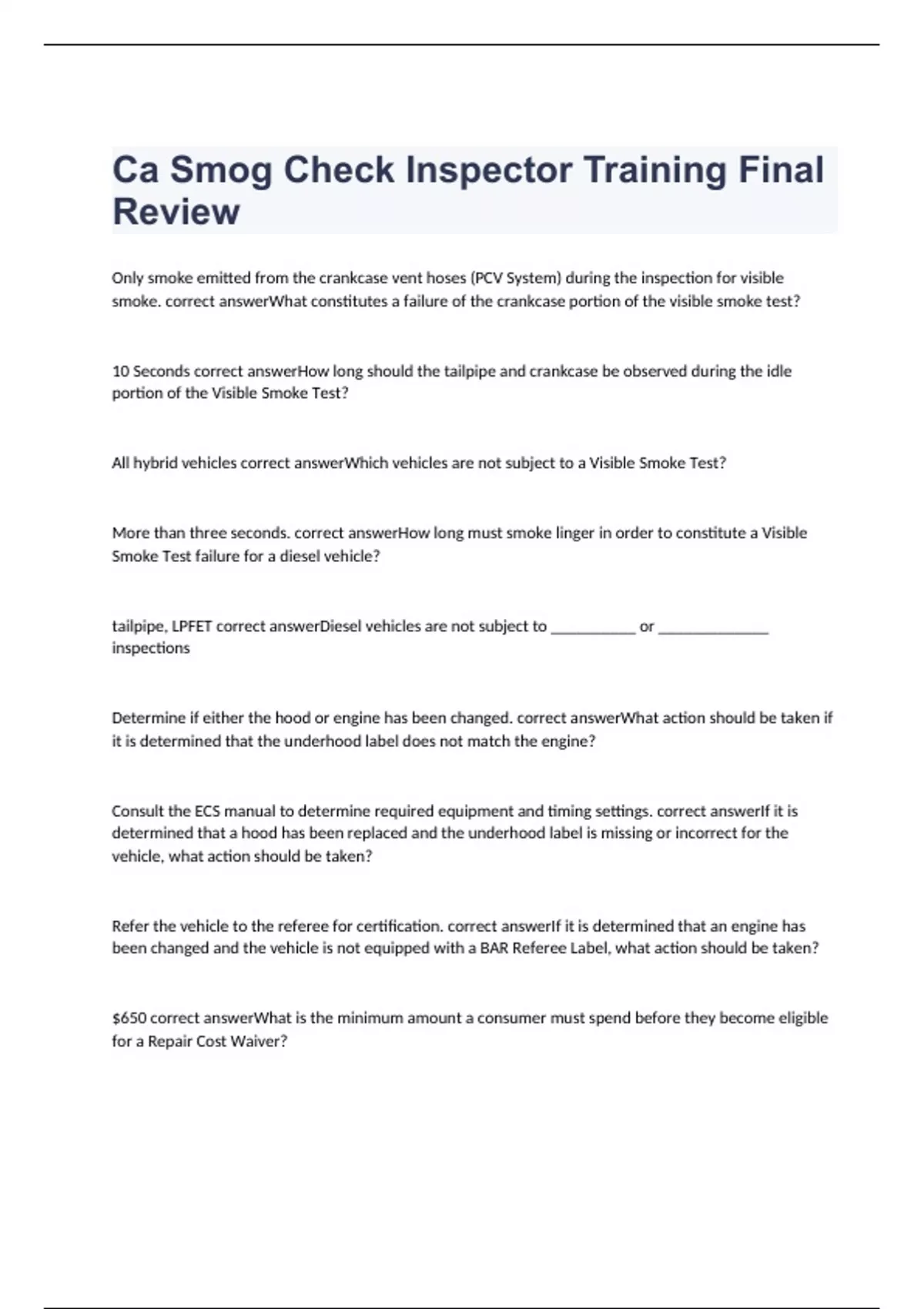 Ca Smog Check Inspector Training Final Review exam 2023