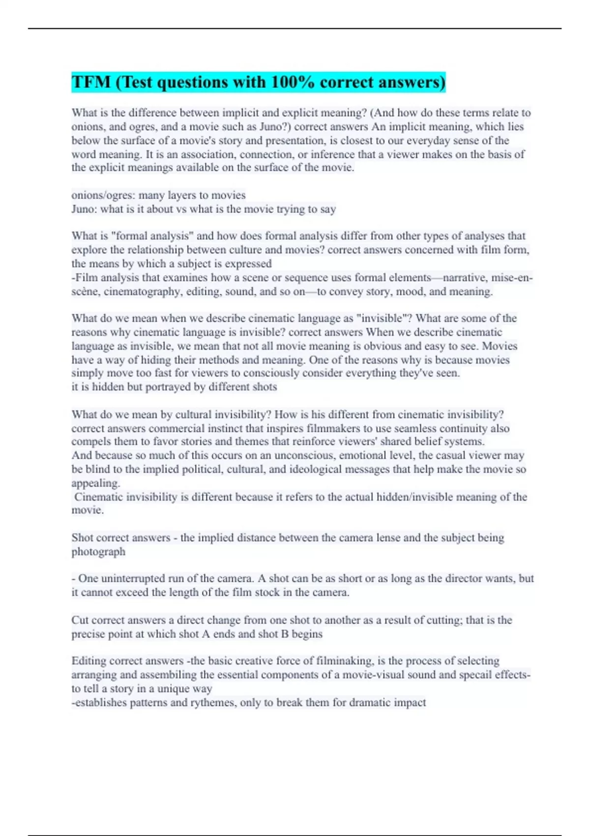 What is the difference between implicit and explicit meaning? (And how do these terms relate to onions, and ogres, and a movie such as Juno?) correct answers An implicit meaning, which lies below the surface of a movie's story and presentation, is closest to our everyday sense of the word meaning. It is an association, connection, or inference that a viewer makes on the basis of the explicit meanings available on the surface of the movie. onions/ogres: many layers to movies Juno: what is it about vs what is the movie trying to say What is "formal analysis" and how does formal analysis differ from other types of analyses that explore the relationship between culture and movies? correct answers concerned with film form, the means by which a subject is expressed -Film analysis that examines how a scene or sequence uses formal elements—narrative, mise-en-scène, cinematography, editing, sound, and so on—to convey story, mood, and meaning. What do we mean when we describe cinematic language as "invisible"? What are some of the reasons why cinematic language is invisible? correct answers When we describe cinematic language as invisible, we mean that not all movie meaning is obvious and easy to see. Movies have a way of hiding their methods and meaning. One of the reasons why is because movies simply move too fast for viewers to consciously consider everything they've seen. it is hidden but portrayed by different shots What do we mean by cultural invisibility? How is his different from cinematic invisibility? correct answers commercial instinct that inspires filmmakers to use seamless continuity also compels them to favor stories and themes that reinforce viewers' shared belief systems. And because so much of this occurs on an unconscious, emotional level, the casual viewer may be blind to the implied political, cultural, and ideological messages that help make the movie so appealing. Cinematic invisibility is different because it refers to the actual hidden/invisible meaning of the movie. Shot correct answers - the implied distance between the camera lense and the subject being photograph - One uninterrupted run of the camera. A shot can be as short or as long as the director wants, but it cannot exceed the length of the film stock in the camera. Cut correct answers a direct change from one shot to another as a result of cutting; that is the precise point at which shot A ends and shot B begins Editing correct answers -the basic creative force of filminaking, is the process of selecting arranging and assembiling the essential components of a movie-visual sound and specail effects-to tell a story in a unique way -establishes patterns and rythemes, only to break them for dramatic impact
