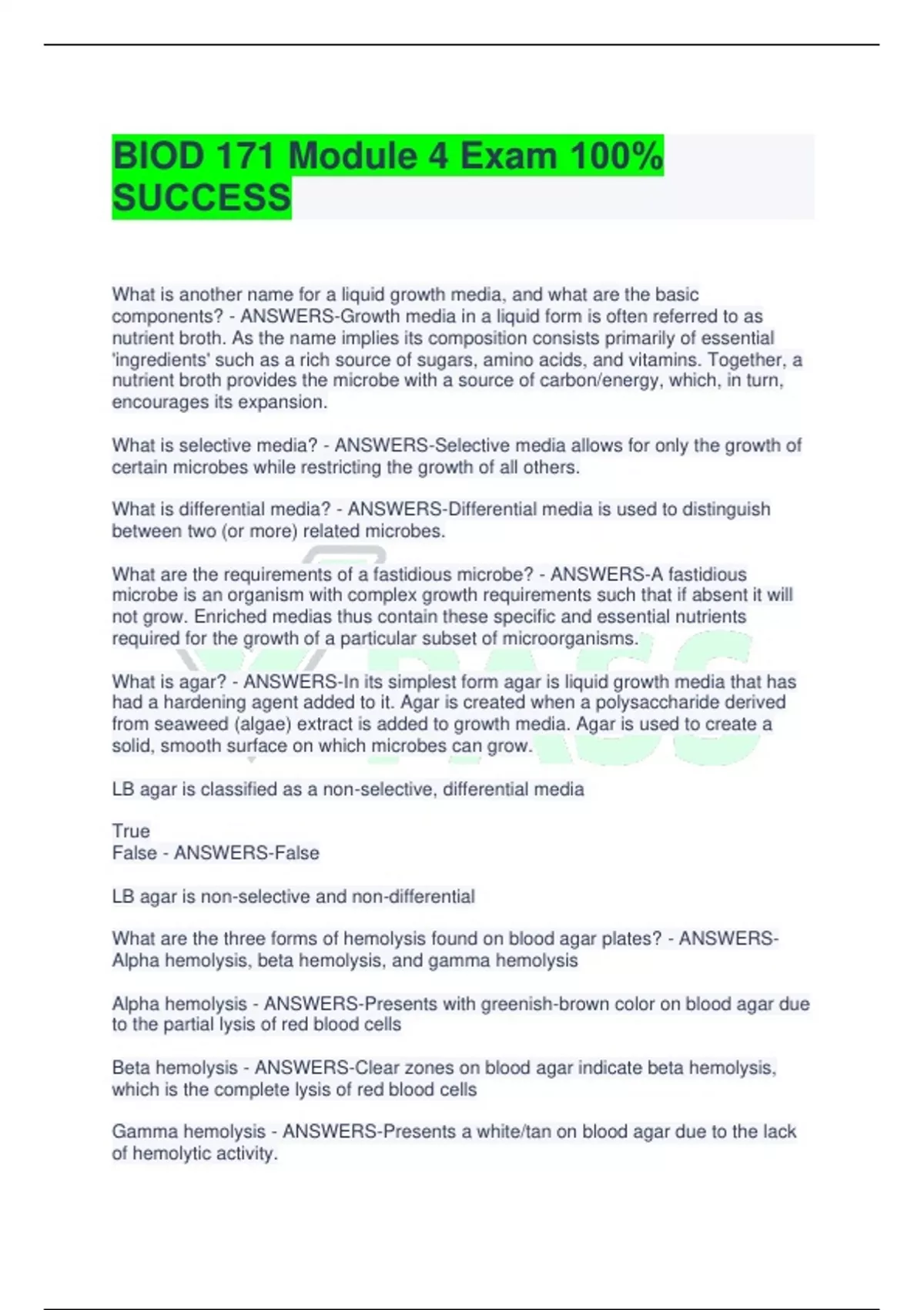 BIOD 171 Module 4 Exam 100% SUCCESS What is another name for a liquid growth media, and what are the basic components? - ANSWERS-Growth media in a liquid form is often referred to as nutrient broth. As the name implies its composition consists primarily of essential 'ingredients' such as a rich source of sugars, amino acids, and vitamins. Together, a nutrient broth provides the microbe with a source of carbon/energy, which, in turn, encourages its expansion. What is selective media? - ANSWERS-Selective media allows for only the growth of certain microbes while restricting the growth of all others. What is differential media? - ANSWERS-Differential media is used to distinguish between two (or more) related microbes. What are the requirements of a fastidious microbe? - ANSWERS-A fastidious microbe is an organism with complex growth requirements such that if absent it will not grow. Enriched medias thus contain these specific and essential nutrients required for the growth of a particular subset of microorganisms. What is agar? - ANSWERS-In its simplest form agar is liquid growth media that has had a hardening agent added to it. Agar is created when a polysaccharide derived from seaweed (algae) extract is added to growth media. Agar is used to create a solid, smooth surface on which microbes can grow. LB agar is classified as a non-selective, differential media True False - ANSWERS-Fals