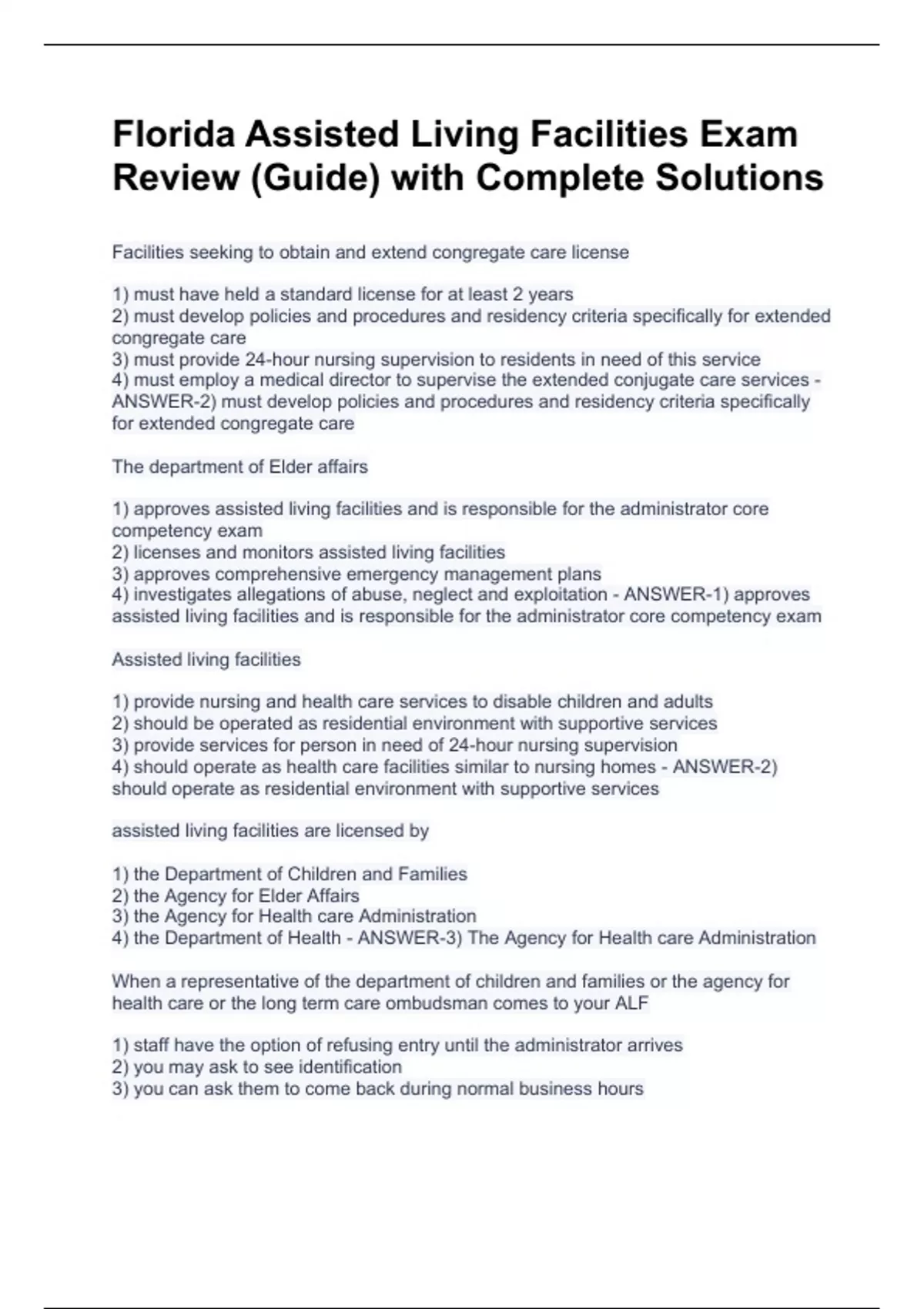 Florida Assisted Living Facilities Exam Review (Guide) with Complete SolutionsFlorida Assisted Living Facilities Exam Review (Guide) with Complete SolutionsFlorida Assisted Living Facilities Exam Review (Guide) with Complete SolutionsFlorida Assisted Living Facilities Exam Review (Guide) with Complete Solutions Facilities seeking to obtain and extend congregate care license 1) must have held a standard license for at least 2 years 2) must develop policies and procedures and residency criteria specifically for extended congregate care 3) must provide 24-hour nursing supervision to residents in need of this service 4) must employ a medical director to supervise the extended conjugate care services - ANSWER-2) must develop policies and procedures and residency criteria specifically for extended congregate care The department of Elder affairs 1) approves assisted living facilities and is responsible for the administrator core competency exam 2) licenses and monitors assisted living facilities 3) approves comprehensive emergency management plans 4) investigates allegations of abuse, neglect and exploitation - ANSWER-1) approves assisted living facilities and is responsible for the administrator core competency exam Assisted living facilities 1) provide nursing and health care services to disable children and adults 2) should be operated as residential environment with supportive services 3) provide services for person in need of 24-hour nursing supervision 4) should operate as health care facilities similar to nursing homes - ANSWER-2) should operate as residential environment with supportive services assisted living facilities are licensed by 1) the Department of Children and Families 2) the Agency for Elder Affairs 3) the Agency for Health care Administration 4) the Department of Health - ANSWER-3) The Agency for Health care Administration When a representative of the department of children and families or the agency for health care or the long term care ombudsman comes to your ALF 1) staff have the option of refusing entry until the administrator arrives 2) you may ask to see identification 3) you can ask them to come back during normal business hours