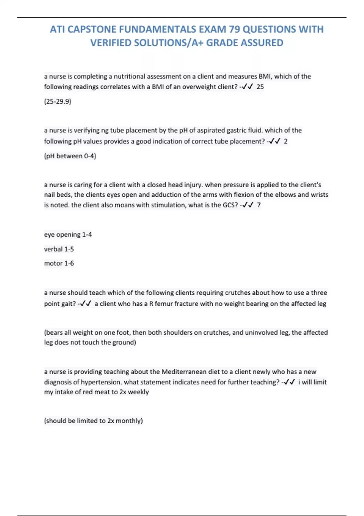 ATI CAPSTONE FUNDAMENTALS EXAM 79 QUESTIONS WITH VERIFIED SOLUTIONS/A+ GRADE ASSURED a nurse is completing a nutritional assessment on a client and measures BMI, which of the following readings correlates with a BMI of an overweight client? - 25 (25-29.9) a nurse is verifying ng tube placement by the pH of aspirated gastric fluid. which of the following pH values provides a good indication of correct tube placement? - 2 (pH between 0-4) a nurse is caring for a client with a closed head injury. when pressure is applied to the client's nail beds, the clients eyes open and adduction of the arms with flexion of the elbows and wrists is noted. the client also moans with stimulation, what is the GCS? - 7 eye opening 1-4 verbal 1-5 motor 1-6 a nurse should teach which of the following clients requiring crutches about how to use a three point gait? - a client who has a R femur fracture with no weight bearing on the affected leg (bears all weight on one foot, then both shoulders on crutches, and uninvolved leg, the affected leg does not touch the ground) a nurse is providing teaching about the Mediterranean diet to a client newly who has a new diagnosis of hypertension. what statement indicates need for further teaching? - i will limit my intake of red meat to 2x weekly (should be limited to 2x monthly) ATI CAPSTONE FUNDAMENTALS EXAM 79 QUESTIONS WITH VERIFIED SOLUTIONS/A+ GRADE ASSURED incorporate in her daily routine to promote sleep. the nurse would encourage, which of the a nurse is providing dietary education to a client with cholecystitis who has been prescribed a low-fat diet. which of the following meal selections by the client indicates understanding of education? - roast turkey, rice pilaf, green beans a client with cystocele is encouraged to exercise to strengthen pelvic floor muscles and prevent pelvic organ prolapse. What exercise will the client need to perform - Kegals (reduce pelvic prolapse and stress urinary incontinence) a nurse is caring for an older adult client with delirium. which intervention will most likely reduce the client's risk for falls? - hourly rounding by the nurse a nurse is caring for a client who has been prescribed furosemide. which of the following foods should the nurse encourage this to include in his diet? - oranges (along with dried fruits, tomatoes, avocados, dried peas, meats, broccoli, bananas are good for a potassium wasting diuretic
