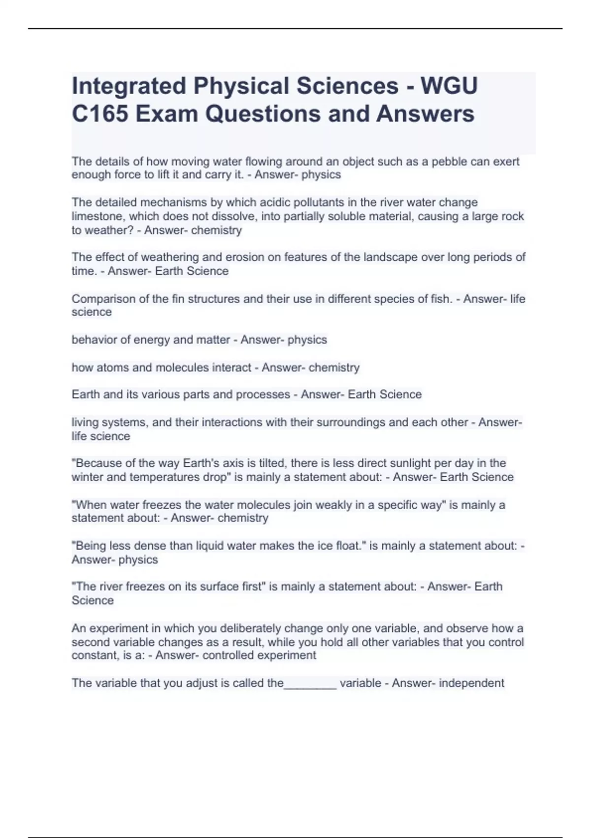 Integrated Physical Sciences - WGU C165 Exam Questions and Answers