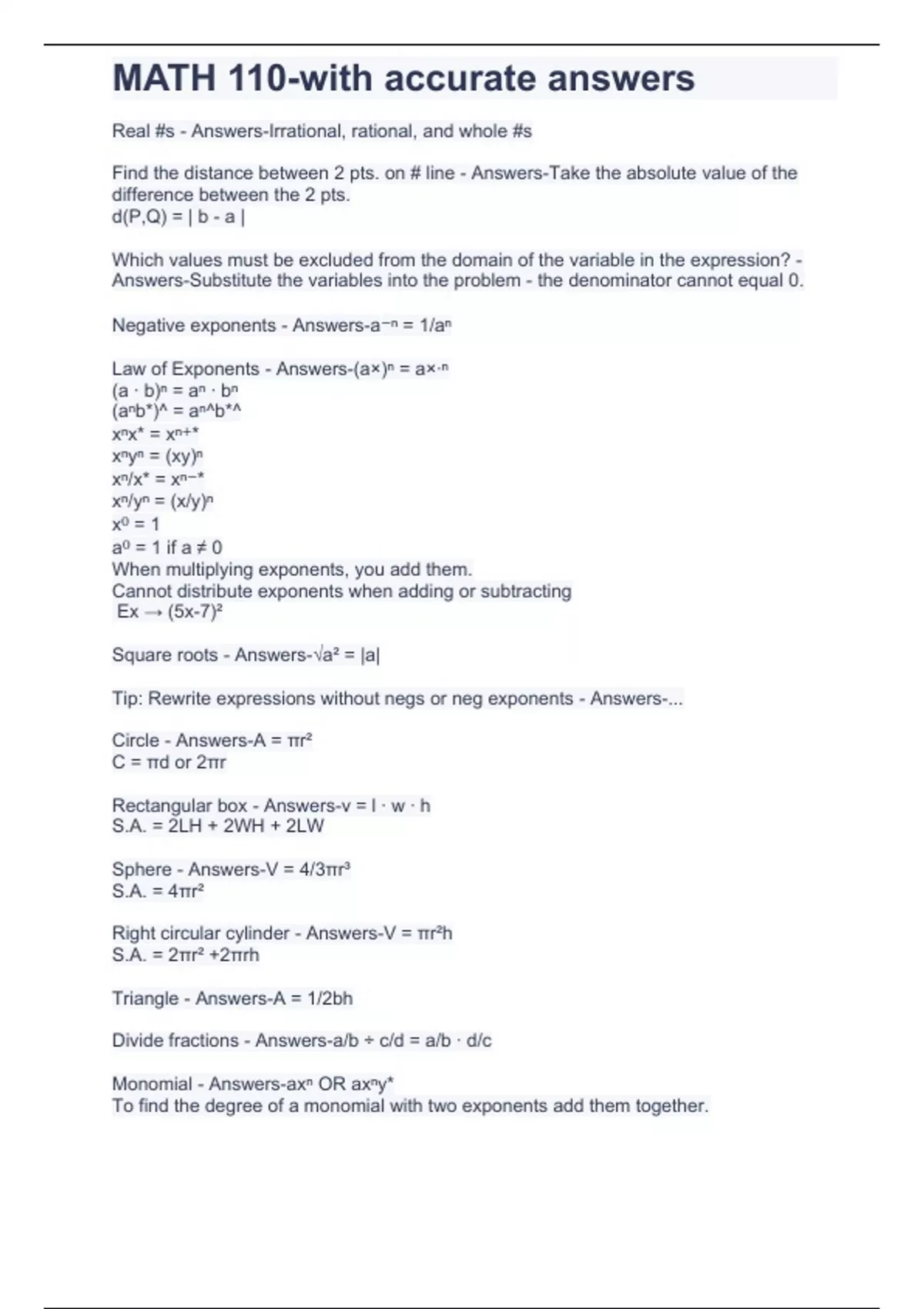 Perfect Square of Factoring Standard Polynomial - Answers-Factor the trinomial into 2 binomial factors of the form (x+a)(x+b) Look for 2 integers whose rmula - Answers-x² + 2ax + a² = (x+a)² x² - 2ax + a² = (x-a)² where a = √third term x = √first term Difference of 2 cubes - Answers-x³ - a³ = (x-a) (x² + ax + a²) Sum of 2 cubes - Answers-x³ + a³ + (x+a) (x² - ax + a²) product is the last term and whose sum is the second term Exam (elaborations) maths110
