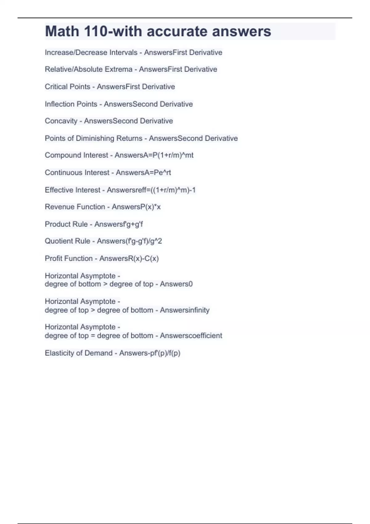 Quotient Rule - Answers(f'g-g'f)/g^2 Profit Function – Answers R(x)-C(x) Horizontal Asymptote - degree of bottom > degree of top - Answers0 Horizontal Asymptote - degree of top > degree of bottom – Answers infinity Horizontal Asymptote - degree of top = degree of bottom – Answers coefficient Elasticity of Demand - Answers-pf'(p)/f(p