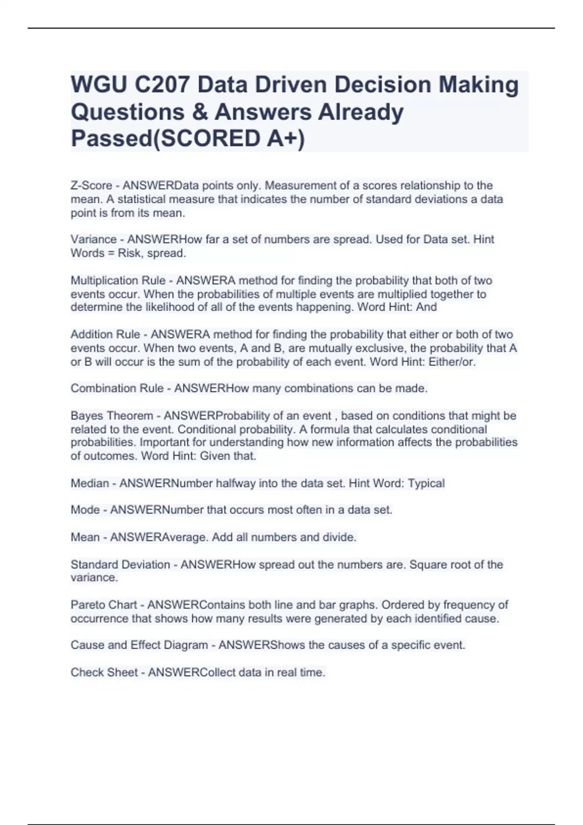 Z-Score - ANSWERData points only. Measurement of a scores relationship to the mean. A statistical measure that indicates the number of standard deviations a data point is from its mean. Variance - ANSWERHow far a set of numbers are spread. Used for Data set. Hint Words = Risk, spread. Multiplication Rule - ANSWERA method for finding the probability that both of two events occur. When the probabilities of multiple events are multiplied together to determine the likelihood of all of the events happening. Word Hint: And Addition Rule - ANSWERA method for finding the probability that either or both of two events occur. When two events, A and B, are mutually exclusive, the probability that A or B will occur is the sum of the probability of each event. Word Hint: Either/or. Combination Rule - ANSWERHow many combinations can be made. Bayes Theorem - ANSWERProbability of an event , based on conditions that might be related to the event. Conditional probability. A formula that calculates conditional probabilities. Important for understanding how new information affects the probabilities of outcomes. Word Hint: Given that. Median - ANSWERNumber halfway into the data set. Hint Word: Typical Mode - ANSWERNumber that occurs most often in a data set. Mean - ANSWERAverage. Add all numbers and divide.