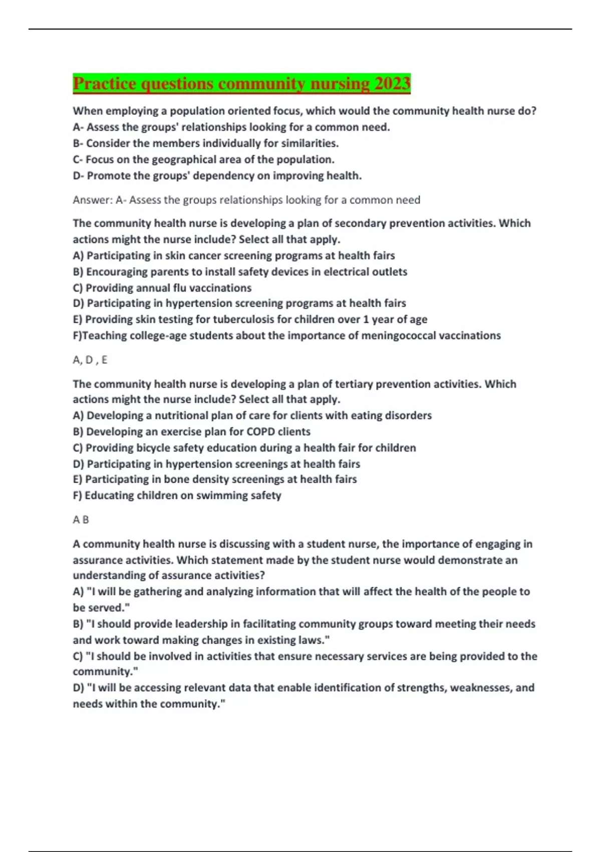 Practice questions community nursing exam 2023 with answers