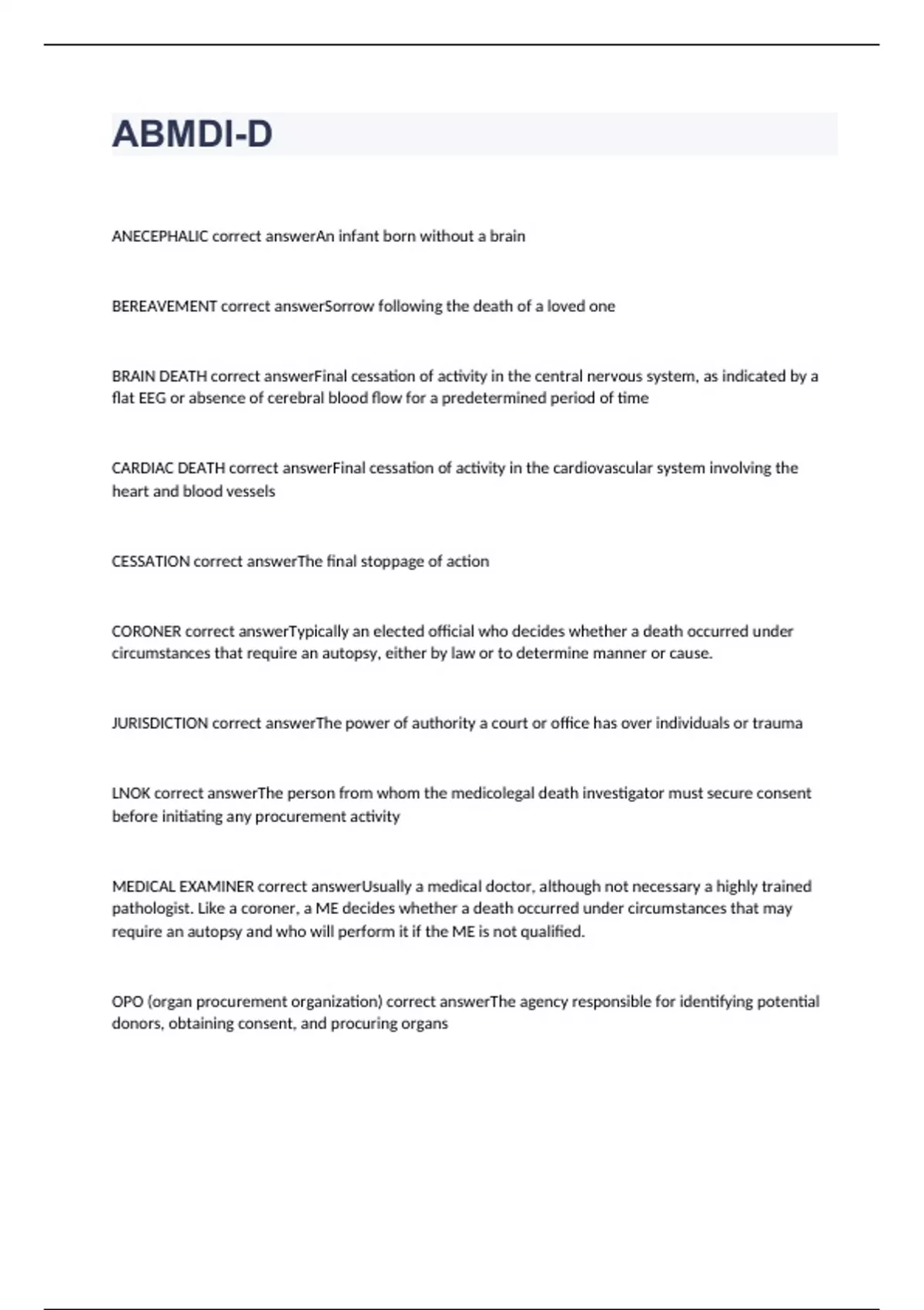 ANECEPHALIC An infant born without a brain BEREAVEMENT Sorrow following the death of a loved one BRAIN DEATH Final cessation of activity in the central nervous system, as indicated by a flat EEG or absence of cerebral blood flow for a predetermined period of time CARDIAC DEATH Final cessation of activity in the cardiovascular system involving the heart and blood vessels CESSATION The final stoppage of action CORONER Typically an elected official who decides whether a death occurred under circumstances that require an autopsy, either by law or to determine manner or cause. JURISDICTION The power of authority a court or office has over individuals or trauma LNOK The person from whom the medicolegal death investigator must secure consent before initiating any procurement activity MEDICAL EXAMINER Usually a medical doctor, although not necessary a highly trained pathologist. Like a coroner, a ME decides whether a death occurred under circumstances that may require an autopsy and who will perform it if the ME is not qualified. OPO (organ procurement organization) The agency responsible for identifying potential donors, obtaining consent, and procuring organs
