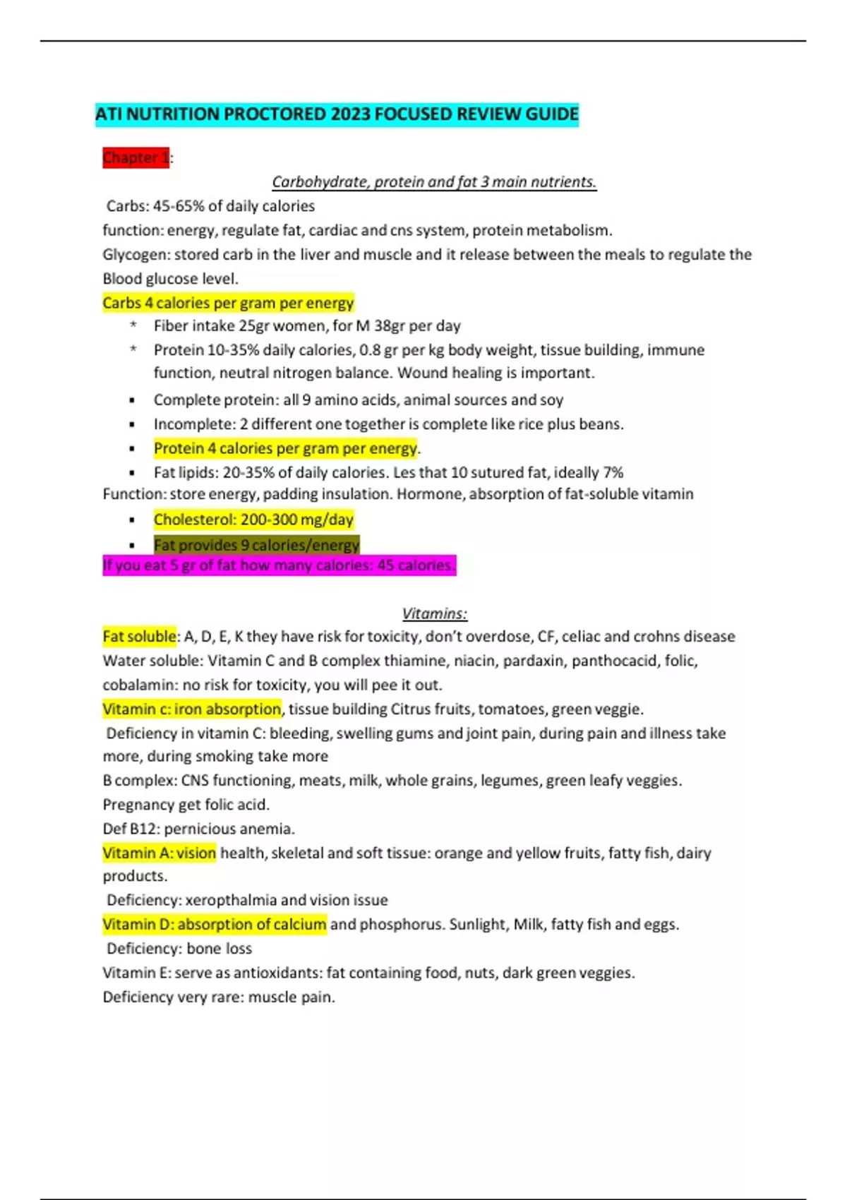Chapter 1: Carbohydrate, protein and fat 3 main nutrients. Carbs: 45-65% of daily calories function: energy, regulate fat, cardiac and cns system, protein metabolism. Glycogen: stored carb in the liver and muscle and it release between the meals to regulate the Blood glucose level. Carbs 4 calories per gram per energy * Fiber intake 25gr women, for M 38gr per day * Protein 10-35% daily calories, 0.8 gr per kg body weight, tissue building, immune function, neutral nitrogen balance. Wound healing is important. ▪ Complete protein: all 9 amino acids, animal sources and soy ▪ Incomplete: 2 different one together is complete like rice plus beans. ▪ Protein 4 calories per gram per energy. ▪ Fat lipids: 20-35% of daily calories. Les that 10 sutured fat, ideally 7% Function: store energy, padding insulation. Hormone, absorption of fat-soluble vitamin ▪ Cholesterol: 200-300 mg/day ▪ Fat provides 9 calories/energy If you eat 5 gr of fat how many calories: 45 calories. Vitamins: Fat soluble: A, D, E, K they have risk for toxicity, don’t overdose, CF, celiac and crohns disease Water soluble: Vitamin C and B complex thiamine, niacin, pardaxin, panthocacid, folic, cobalamin: no risk for toxicity, you will pee it out. Vitamin c: iron absorption, tissue building Citrus fruits, tomatoes, green veggie. Deficiency in vitamin C: bleeding, swelling gums and joint pain, during pain and illness take more, during smoking take more B complex: CNS functioning, meats, milk, whole grains, legumes, green leafy veggies. Pregnancy get folic acid. Def B12: pernicious anemia. Vitamin A: vision health, skeletal and soft tissue: orange and yellow fruits, fatty fish, dairy products. Deficiency: xeropthalmia and vision issue Vitamin D: absorption of calcium and phosphorus. Sunlight, Milk, fatty fish and eggs. Deficiency: bone loss Vitamin E: serve as antioxidants: fat containing food, nuts, dark green veggies. Deficiency very rare: muscle pain. Vitamin K: blood clotting and bone maintenance, dark green veggie, carrots deficiency: increase bleeding time. Antidote for Warfarin Electrolytes: Sodium Na: 136-145 normal level. function: fluid balance and nerve and muscle function. Food high in Na: salt and processed food. Hyper: hypervolemia and HTN Hypo: confusion, muscle cramps, headache, fatigue, NV Potassium K: 3.5-5 normal level. Function: ICF, nerve function, muscle and heart contraction FOOD HIGH IN K: bananas, potatoes, tomatoes, oranges, avocadoes, dark green veggies, dried foods Hyper: dysrhythmias, muscle weakness, NV, confusion Hypo: dysrhythmias, muscle cramps and constipation Chloride Cl: 98-106 is normal level Function: Help with digestion, ICF and ECF. Find in salt Hyper: NV Hypo: muscle cramps, GI upset Calcium CA: 9-10.5 is normal level Function: bone, teeth formation, nerve and muscle function, BP Food: dairy, dark green veggie, fruits Hyper: constipation, decreased DTR, kidney stones, lethargy Hypo: Positive Chvostek and Trousers’, muscle spasm and tingling Magnesium Mg: 1.3-2.1 Function: Nerve, muscle function, bone formation, biochemical reactions Foods: nuts, veggies, whole grain, milk Hyper: NV/ hypotension, muscle weakness, lethargy. Respiratory and cardiac arrest Hypo: increased DTR, dysthymias, seizure, tremors Ph: Phosphorus 3-4.5 is normal level Function: bone and teeth formation Dairy and cheese, dark green veggies, fish and legumes Inverse relationship with calcium, high Calcium low Ph Trace Minerals: 1. Iodine: synthesis of thyroxine required level is 100-150mcg. Find in table salt and sea food 2. Iron: make help HH. Meat, fish, legumes, Vitamin C, constipation, increase fiber intake, tooth discoloration. Z track for IM injection. Calcium lower absorption 3. Zinc: important in immune functions, NUTS, cereal and beans 4. Fluoride: help protect cavities, in water Water: 2-3 L/day .minimum requirement level is 1.5 L I should = O Sensible fluid loss: can be measured. Urine, vomit Insensible: fluid loss from lung, water excreted in the feces. Sweat Older adult and children greater risk for dehydration S/S: dehydration poor skin turgor, confusion, hypotension, decrease Urine output, dry mucous membrane, increase urine osmolarity. Sunken in babies. Chapter 2: Catabolism: breaking down of substance to release energy Anabolism uses energy to repair BMR: energy required for involuntary activities within 24hrs. heart function, respiration INCREASE BMMR: Male gender, more muscle mass, periods of growth such as puberty, stress, exposure to cold, disease and illness, hyperthyroidism, seizure, surgery, pregnancy and lactation Decrease: female gender, shorter height, less muscle mass, starvation, older age and hypothyroidism. Nitrogen balance: component amino acids: nitrogen intake-nitrogen excretion For the Adults this nitrogen balance should be neutral. Negative nitrogen: insufficient protein intake, malnutrition or aging, illness. Positive nitrogen balance: growth, pregnancy and lactation Chapter 3: S/s of malnutrition: poor wound healing, hair loss, brittle hair, weakness, poor LOC and look for pre albumin (15-36) albumin (3.5-5) ▪ Increase protein and calories: add milk powder to milk, whole milk, high calories food, cheese, peanut butter, use of supplement and collaborate with dietitian. ▪ Calculations weight change: usual weight- current weight/ usual weight *100 ▪ 2% weight loss in 1 wk. or 7.5% weight loss in 3 months indicate weight loss. when to weight them? early in the morning BMI: kg/m (WEIGHT (kg)/ Height (m)) BMI ranges include: Under 18.5 is underweight 18.5-24.9 healthy 25-29.9 overweight 30 or more is obese 300 calories equal 1 pound. Decrease 500 calories a week lose 1 lb. in 1 wk. 1lb =2.2 kg Pt teaching: monitor hunger 1-10 scale before eating. Certain food should not be forbidden. Moderation is good. Weight loss is not consistent. Don’t weight daily for fluctuations. Eat meal free of distraction, not in front of TV Chapter 4: 5 or more serving of veggie, fruits daily i