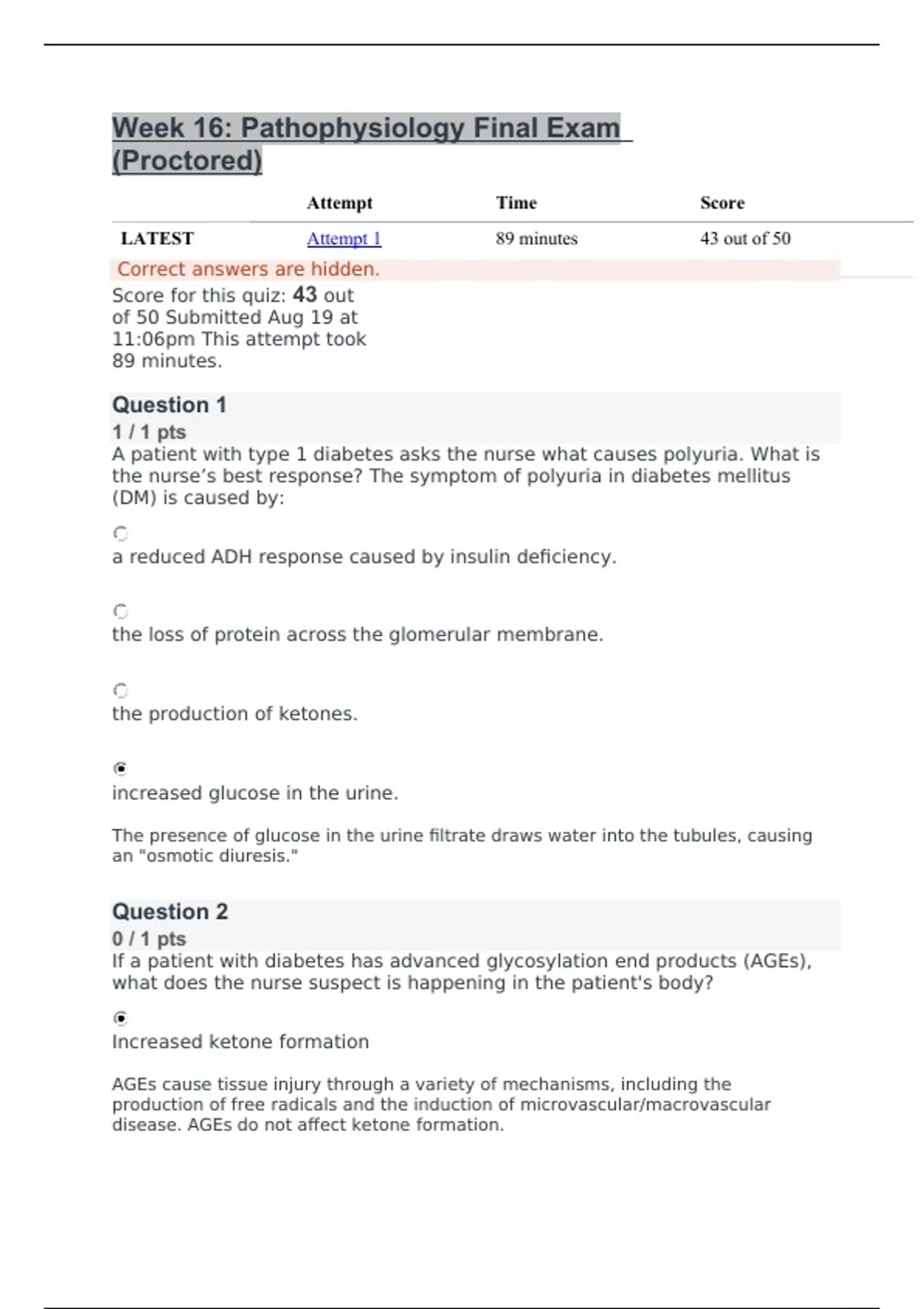 A patient with type 1 diabetes asks the nurse what causes polyuria. What is the nurse’s best response? The symptom of polyuria in diabetes mellitus (DM) is caused by: a reduced ADH response caused by insulin deficiency. the loss of protein across the glomerular membrane. the production of ketones. increased glucose in the urine. The presence of glucose in the urine filtrate draws water into the tubules, causing an "osmotic diuresis." If a patient with diabetes has advanced glycosylation end products (AGEs), what does the nurse suspect is happening in the patient's body? Increased ketone formation AGEs cause tissue injury through a variety of mechanisms, including the production of free radicals and the induction of microvascular/macrovascular disease. AGEs do not affect ketone formation. Tissue/cellular injury Dawn phenomenon Reduction of chronic complications Which information should the nurse include in a lecture on syndrome of inappropriate antidiuretic hormone (SIADH)? SIADH results in excessive: renal retention of sodium and water. renal excretion of sodium without water retention. .........................................CONTINUED............................................