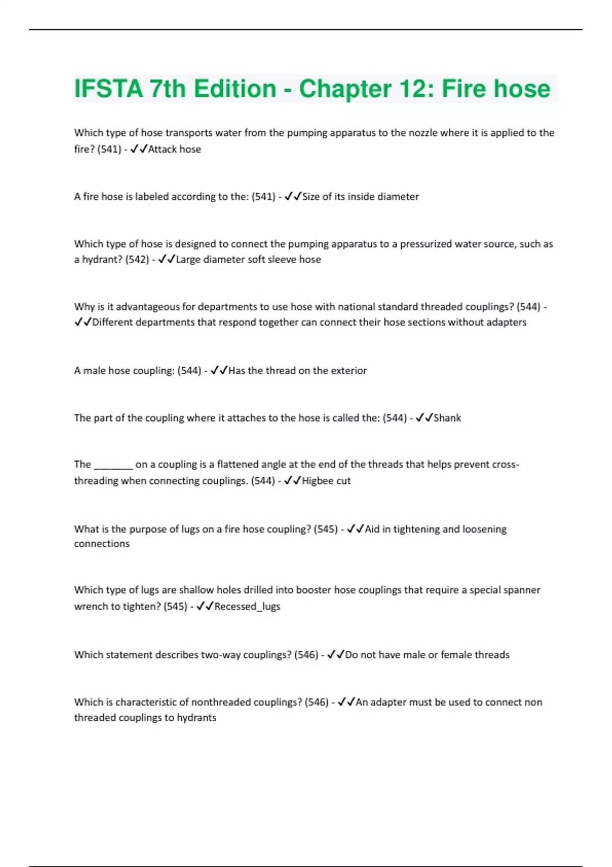 threading when conn ecting couplings. (544) - ✔✔Higbee cut What is the purpose of lugs on a fire hose coupling? (545) - ✔✔Aid in tightening and loosening connections Which type of lugs are shallow holes drilled into booster hose couplings that require a special spanner wren ch to tighten? (545) - ✔✔Recessed_lugs Which statement describes two -way couplings? (546) - ✔✔Do not have male or female threads Which is characteristic of nonthreaded couplings? (546) - ✔✔An adapter must be used to connect non threaded couplings to hydrants