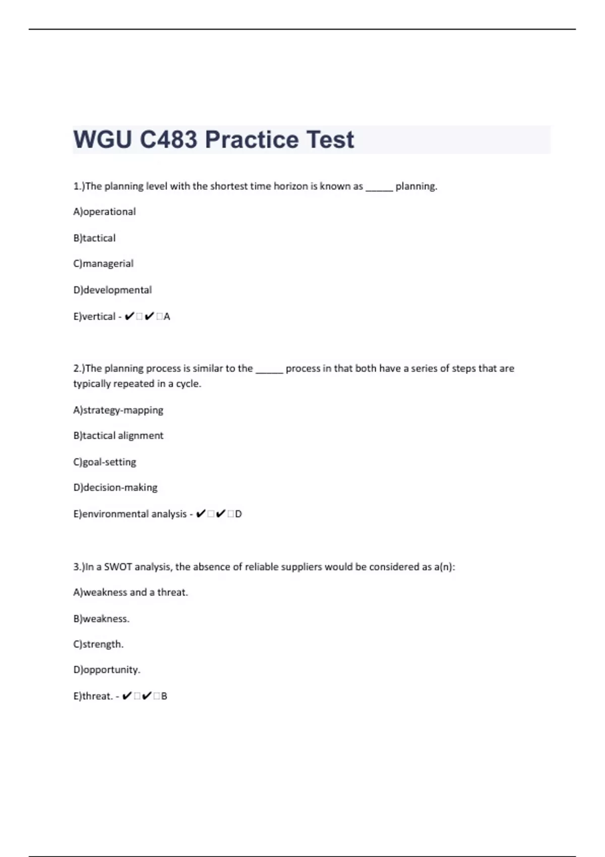 1.)The planning level with the shortest time horizon is known as _____ planning. A)operational B)tactical C)managerial D)developmental E)vertical - ️️A 2.)The planning process is similar to the _____ process in that both have a series of steps that are typically repeated in a cycle. A)strategy-mapping B)tactical alignment C)goal-setting D)decision-making E)environmental analysis - ️️D 3.)In a SWOT analysis, the absence of reliable suppliers would be considered as a(n): A)weakness and a threat. B)weakness. C)strength. D)opportunity. E)threat. - ️️B