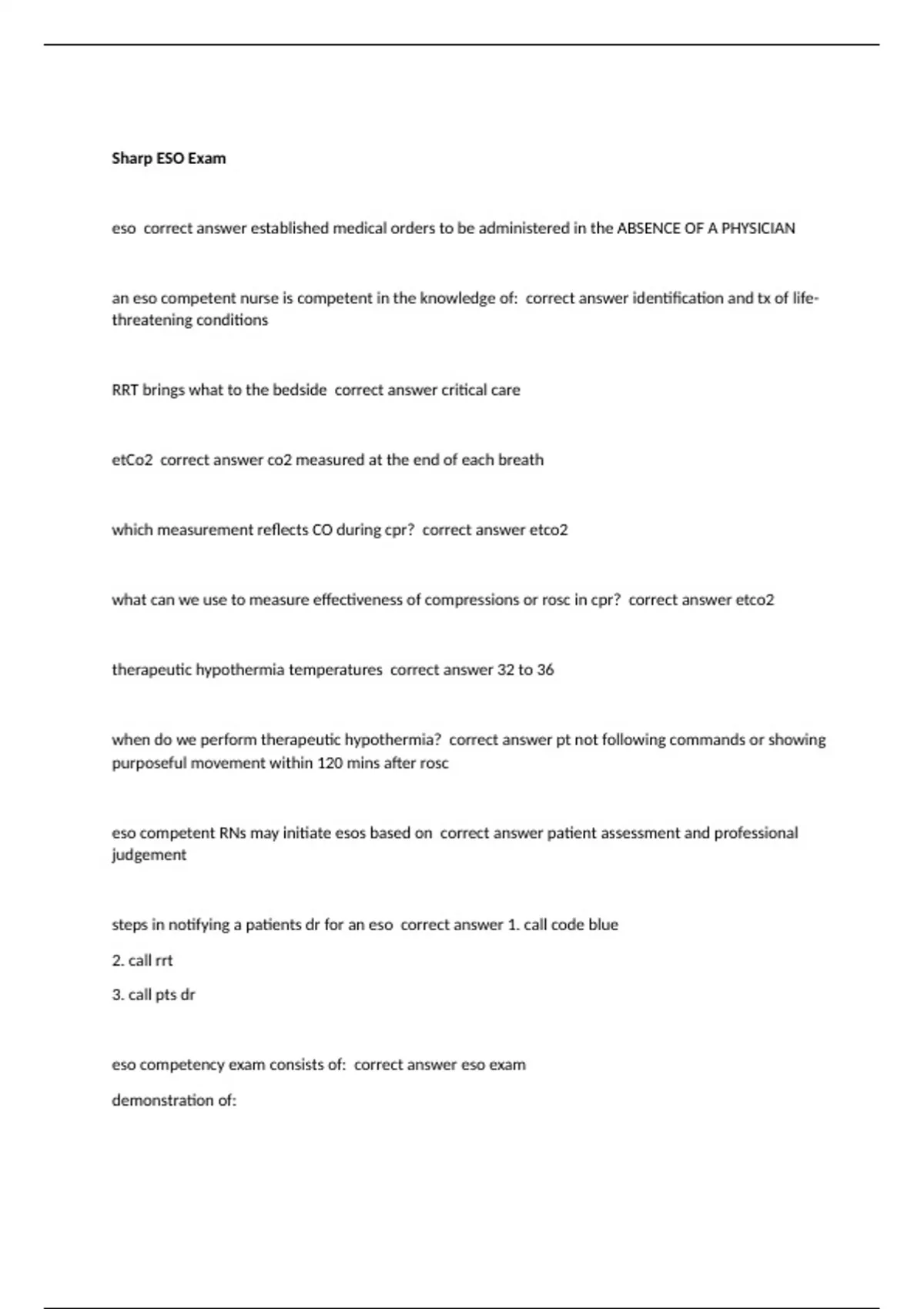 eso correct answer established medical orders to be administered in the ABSENCE OF A PHYSICIAN an eso competent nurse is competent in the knowledge of: correct answer identification and tx of life-threatening conditions RRT brings what to the bedside correct answer critical care etCo2 correct answer co2 measured at the end of each breath which measurement reflects CO during cpr? correct answer etco2 what can we use to measure effectiveness of compressions or rosc in cpr? correct answer etco2 therapeutic hypothermia temperatures correct answer 32 to 36 when do we perform therapeutic hypothermia? correct answer pt not following commands or showing purposeful movement within 120 mins after rosc eso competent RNs may initiate esos based on correct answer patient assessment and professional judgement steps in notifying a patients dr for an eso correct answer 1. call code blue 2. call rrt 3. call pts dr eso competency exam consists of: correct answer eso exam demonstration of: defibrillation, cardioversion, pacing