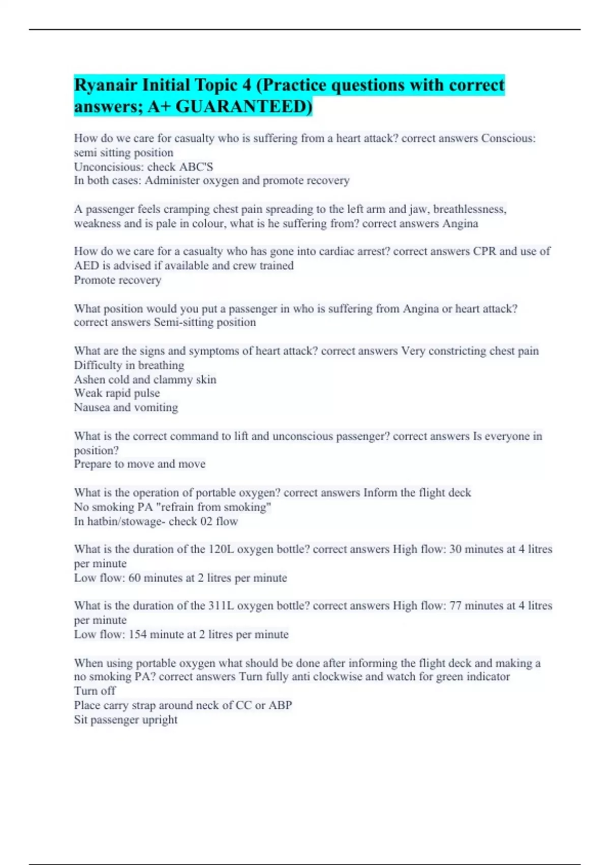 How do we care for casualty who is suffering from a heart attack? correct answers Conscious: semi sitting position Unconcisious: check ABC'S In both cases: Administer oxygen and promote recovery A passenger feels cramping chest pain spreading to the left arm and jaw, breathlessness, weakness and is pale in colour, what is he suffering from? correct answers Angina How do we care for a casualty who has gone into cardiac arrest? correct answers CPR and use of AED is advised if available and crew trained Promote recovery What position would you put a passenger in who is suffering from Angina or heart attack? correct answers Semi-sitting position What are the signs and symptoms of heart attack? correct answers Very constricting chest pain Difficulty in breathing Ashen cold and clammy skin Weak rapid pulse Nausea and vomiting What is the correct command to lift and unconscious passenger? correct answers Is everyone in position? Prepare to move and move What is the operation of portable oxygen? correct answers Inform the flight deck No smoking PA "refrain from smoking" In hatbin/stowage- check 02 flow What is the duration of the 120L oxygen bottle? correct answers High flow: 30 minutes at 4 litres per minute Low flow: 60 minutes at 2 litres per minute What is the duration of the 311L oxygen bottle? correct answers High flow: 77 minutes at 4 litres per minute Low flow: 154 minute at 2 litres per minute When using portable oxygen what should be done after informing the flight deck and making a no smoking PA? correct answers Turn fully anti clockwise and watch for green indicator Turn off Place carry strap around neck of CC or ABP Sit passenger upright