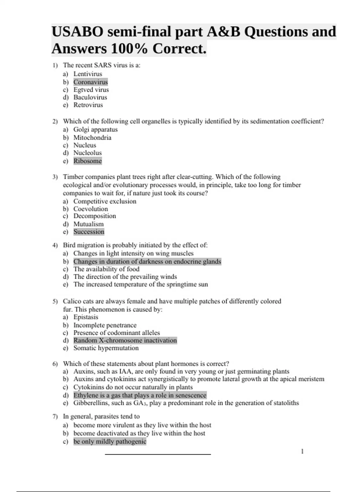 USABO semi-final part A&B Questions and Answers 100% Correct.