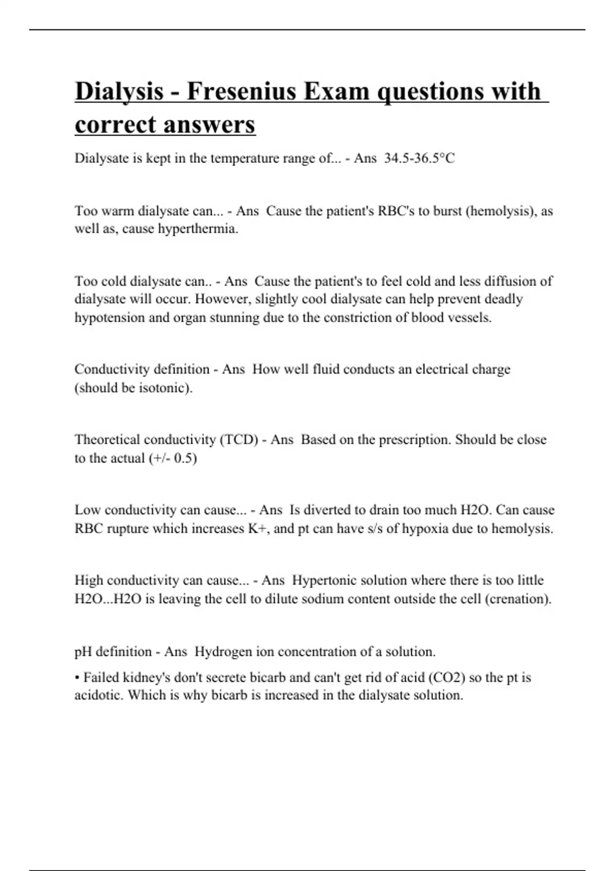 Dialysate is kept in the temperature range of... - Ans 34.5-36.5°C Too warm dialysate can... - Ans Cause the patient's RBC's to burst (hemolysis), as well as, cause hyperthermia. Too cold dialysate can.. - Ans Cause the patient's to feel cold and less diffusion of dialysate will occur. However, slightly cool dialysate can help prevent deadly hypotension and organ stunning due to the constriction of blood vessels. Conductivity definition - Ans How well fluid conducts an electrical charge (should be isotonic). Theoretical conductivity (TCD) - Ans Based on the prescription. Should be close to the actual (+/- 0.5) Low conductivity can cause... - Ans Is diverted to drain too much H2O. Can cause RBC rupture which increases K+, and pt can have s/s of hypoxia due to hemolysis. High conductivity can cause... - Ans Hypertonic solution where there is too little