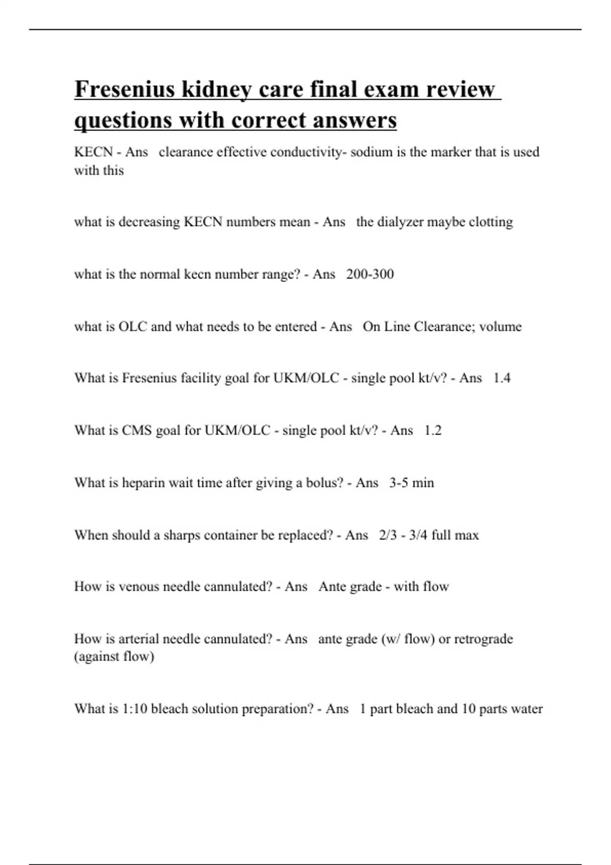 KECN - Ans clearance effective conductivity- sodium is the marker that is used with this what is decreasing KECN numbers mean - Ans the dialyzer maybe clotting what is the normal kecn number range? - Ans 200-300 what is OLC and what needs to be entered - Ans On Line Clearance; volume What is Fresenius facility goal for UKM/OLC - single pool kt/v? - Ans 1.4 What is CMS goal for UKM/OLC - single pool kt/v? - Ans 1.2 What is heparin wait time after giving a bolus? - Ans 3-5 min When should a sharps container be replaced? - Ans 2/3 - 3/4 full max How is venous needle cannulated? - Ans Ante grade - with