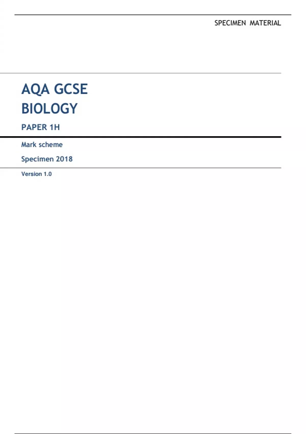 AQA GCSE BIOLOGY PAPER 1H Mark scheme Specimen 2018 Version 1.0