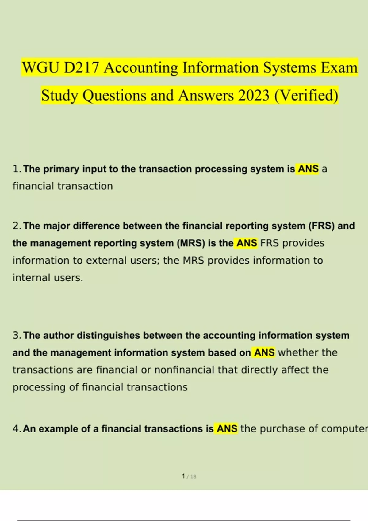 WGU D217 Accounting Information Systems EXAM 2023 STUDY BUNDLE (COMPLETE PACKAGE)(Verified Answers)