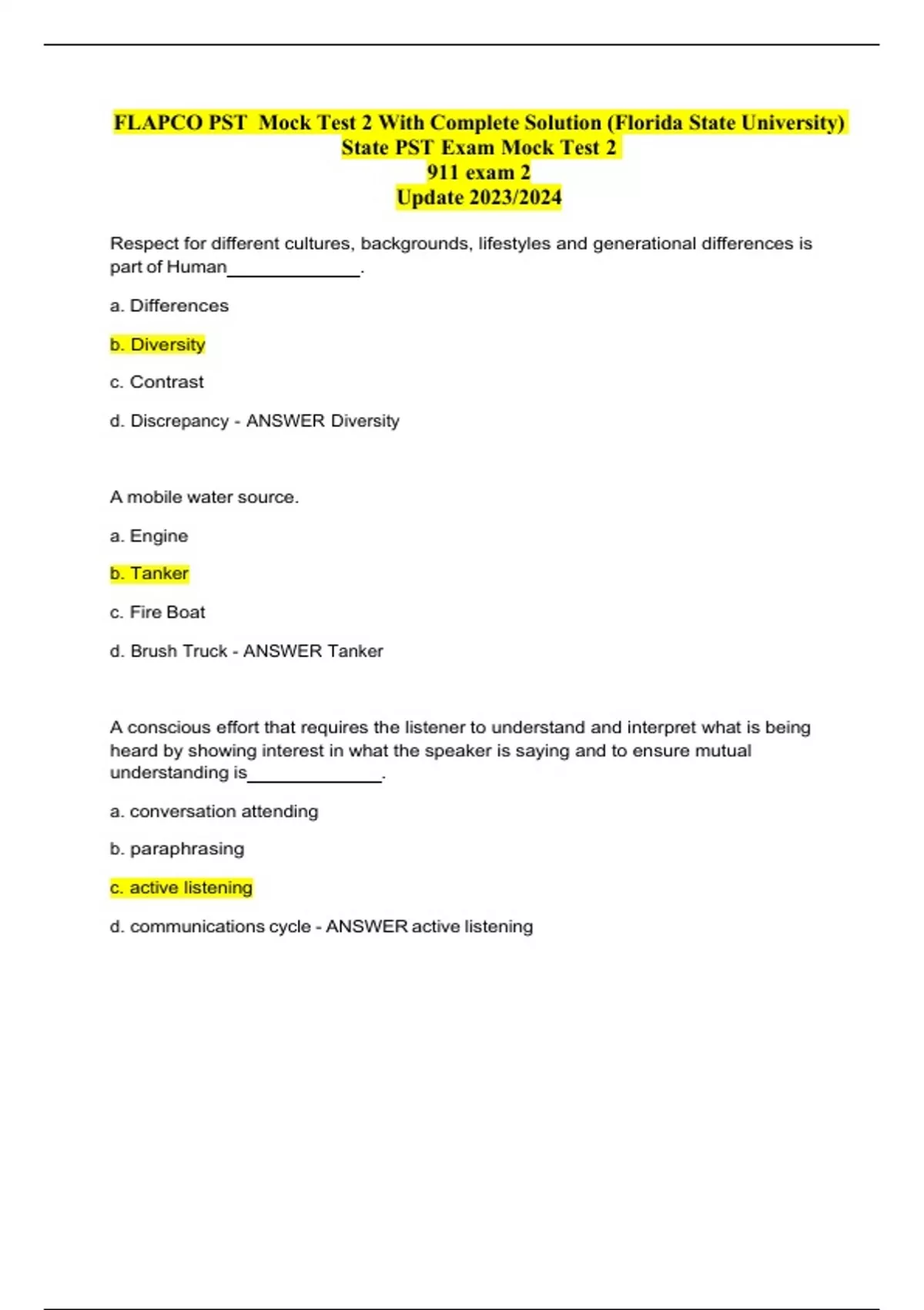 FLAPCO PST Mock Test 2 With Complete Solution (Florida State University) -State PST Exam Mock Test 2 -911 exam 2 Update 2023/2024 Respect for different cultures, backgrounds, lifestyles and generational differences is part of Human _____________ A mobile water source. A conscious effort that requires the listener to understand and interpret what is being heard by showing interest in what the speaker is saying and to ensure mutual understanding is . HIPAA does not prevent PSTs from relaying information to responding units; it does prevent PSTs from relaying information to curious callers.