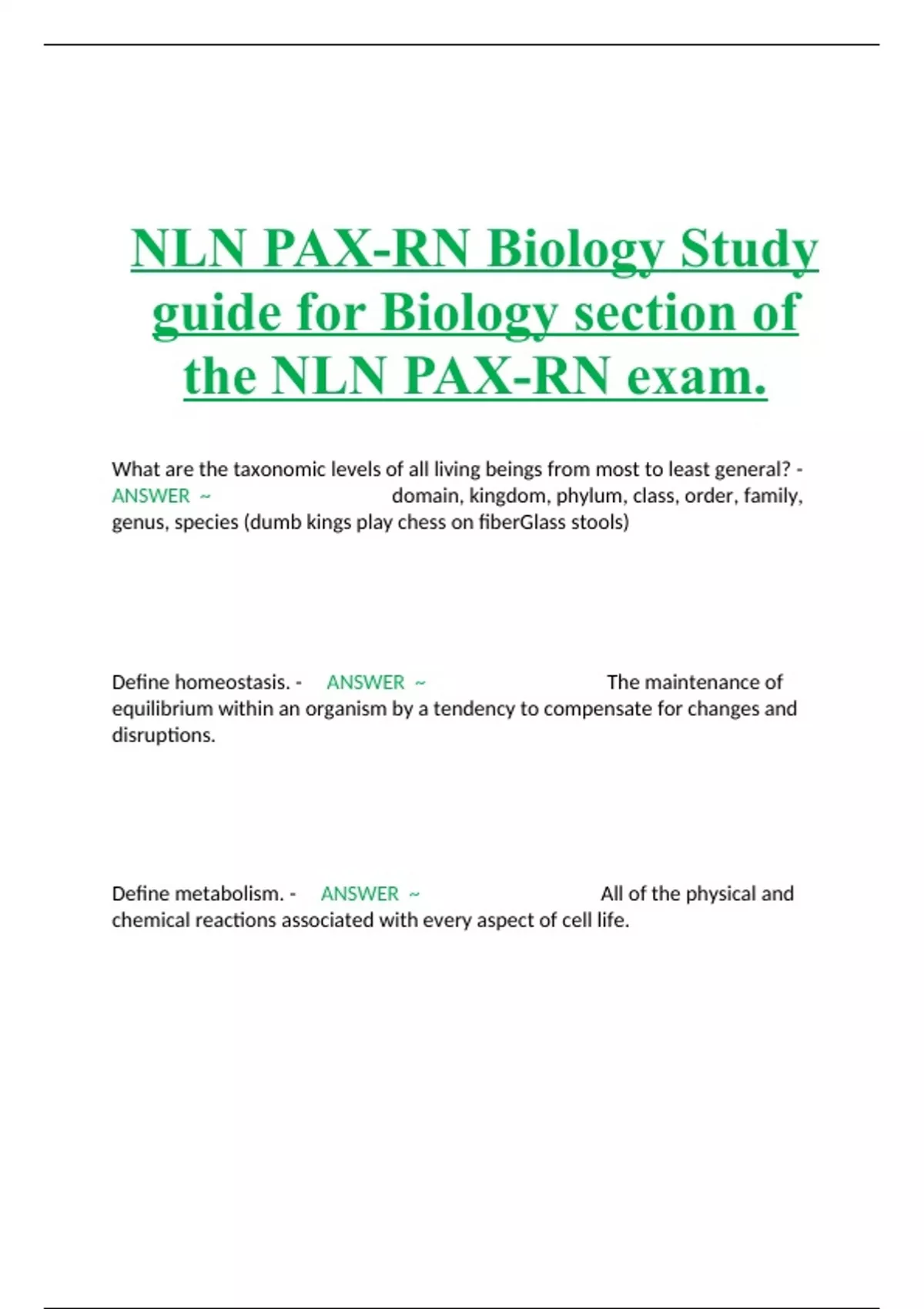 NLN PAX-RN Biology Study guide for Biology section of the NLN PAX-RN exam. What are the taxonomic levels of all living beings from most to least general? - ANSWER ~ domain, kingdom, phylum, class, order, family, genus, species (dumb kings play chess on fiberGlass stools) Define homeostasis. - ANSWER ~ The maintenance of equilibrium within an organism by a tendency to compensate for changes and disruptions. Define metabolism. - ANSWER ~ All of the physical and chemical reactions associated with every aspect of cell life. Define anabolism. - ANSWER ~ An organism's ability to synthesize larger molecules from smaller molecules. Define catabolism. - ANSWER ~ An organism's ability to synthesize smaller molecules from larger ones. By what process is ATP produced? - ANSWER ~ oxidative phosphorylation (OXYPHOS) What is the process by which glycogen is converted to energy? - ANSWER ~ glycogenolysis What are the two main types of chemical bonds? - ANSWER ~ Ionic and covalent.