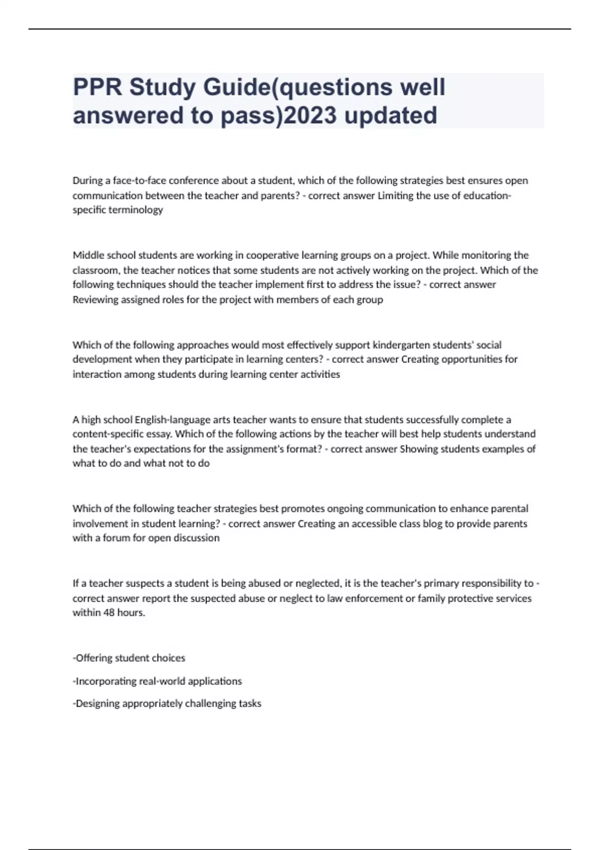 PPR Study Guide(questions well answered to pass)2023 updatedDuring a face-to-face conference about a student, which of the following strategies best ensures open communication between the teacher and parents? - correct answer Limiting the use of education-specific terminology Middle school students are working in cooperative learning groups on a project. While monitoring the classroom, the teacher notices that some students are not actively working on the project. Which of the following techniques should the teacher implement first to address the issue? - correct answer Reviewing assigned roles for the project with members of each group Which of the following approaches would most effectively support kindergarten students' social development when they participate in learning centers? - correct answer Creating opportunities for interaction among students during learning center activities A high school English-language arts teacher wants to ensure that students successfully complete a content-specific essay. Which of the following actions by the teacher will best help students understand the teacher's expectations for the assignment's format? - correct answer Showing students examples of what to do and what not to do Which of the following teacher strategies best promotes ongoing communication to enhance parental involvement in student learning? - correct answer Creating an accessible class blog to provide parents with a forum for open discussion If a teacher suspects a student is being abused or neglected, it is the teacher's primary responsibility to - correct answer report the suspected abuse or neglect to law enforcement or family protective services within 48 hours. -Offering student choices -Incorporating real-world applications -Designing appropriately challenging tasks