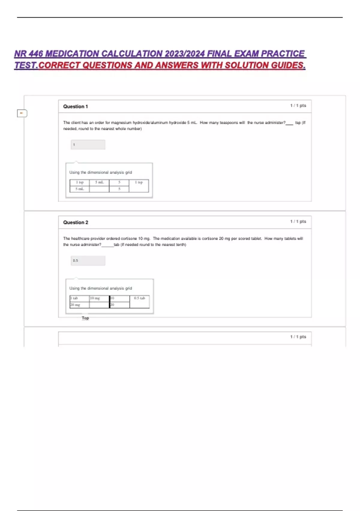 NR 446 MEDICATION CALCULATION 2023/2024 FINAL EXAM PRACTICE TEST.CORRECT QUESTIONS AND ANSWERS WITH SOLUTION GUIDES.