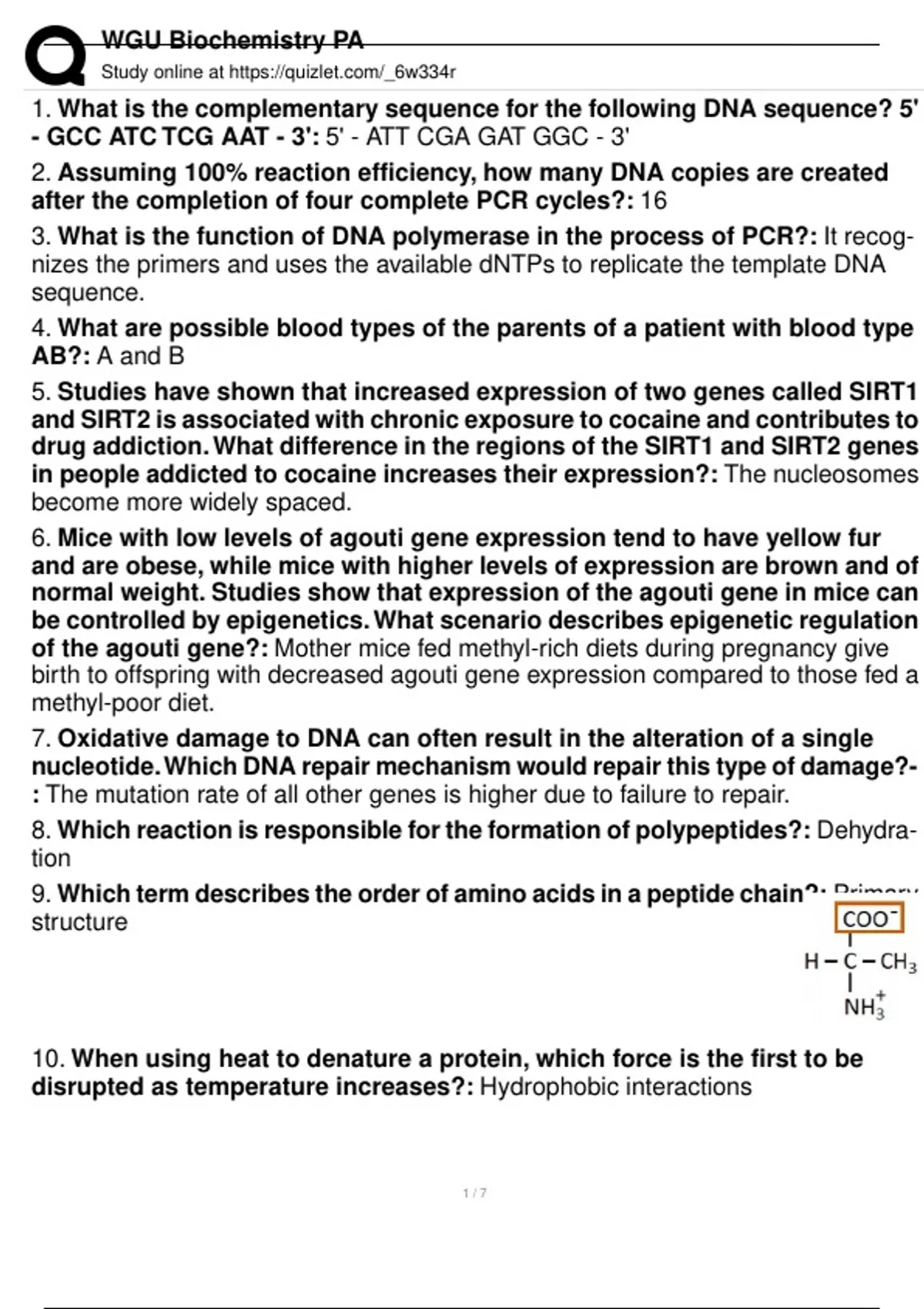 What is the complementary sequence for the following DNA sequence? 5' - GCC ATC TCG AAT - 3': 5' - ATT CGA GAT GGC - 3' 2. Assuming 100% reaction efficiency, how many DNA copies are created after the completion of four complete PCR cycles?: 16 3. What is the function of DNA polymerase in the process of PCR?: It recognizes the primers and uses the available dNTPs to replicate the template DNA sequence. 4. What are possible blood types of the parents of a patient with blood type AB?: A and B