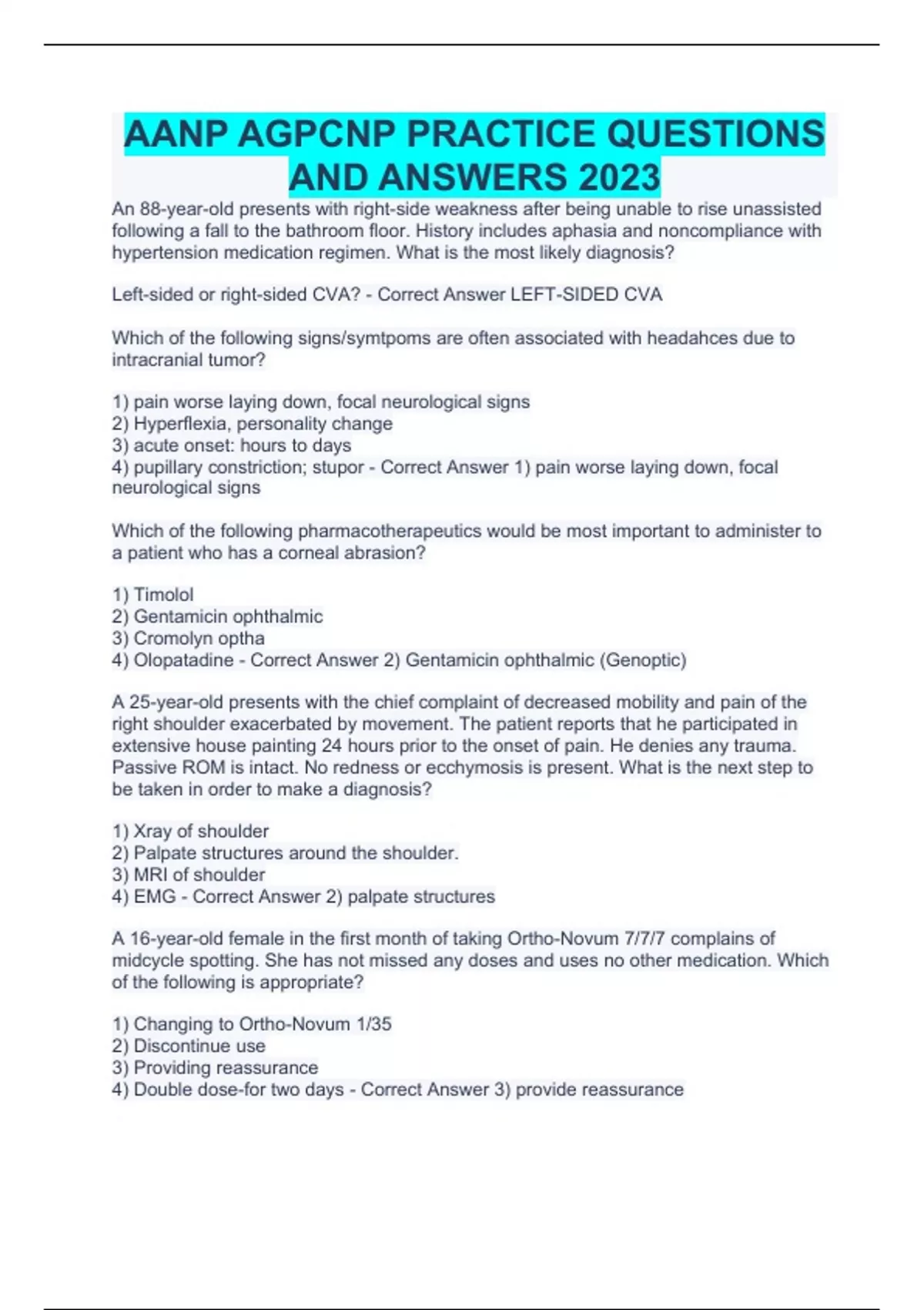 An 88-year-old presents with right-side weakness after being unable to rise unassisted following a fall to the bathroom floor. History includes aphasia and noncompliance with hypertension medication regimen. What is the most likely diagnosis? Left-sided or right-sided CVA? - Correct Answer LEFT-SIDED CVA Which of the following signs/symtpoms are often associated with headahces due to intracranial tumor? 1) pain worse laying down, focal neurological signs 2) Hyperflexia, personality change 3) acute onset: hours to days 4) pupillary constriction; stupor - Correct Answer 1) pain worse laying down, focal neurological signs Which of the following pharmacotherapeutics would be most important to administer to a patient who has a corneal abrasion? 1) Timolol 2) Gentamicin ophthalmic 3) Cromolyn optha 4) Olopatadine - Correct Answer 2) Gentamicin ophthalmic (Genoptic) A 25-year-old presents with the chief complaint of decreased mobility and pain of the right shoulder exacerbated by movement. The patient reports that he participated in extensive house painting 24 hours prior to the onset of pain. He denies any trauma. Passive ROM is intact. No redness or ecchymosis is present. What is the next step to be taken in order to make a diagnosis? 1) Xray of shoulder 2) Palpate structures around the shoulder. 3) MRI of shoulder 4) EMG - Correct Answer 2) palpate structures A 16-year-old female in the first month of taking Ortho-Novum 7/7/7 complains of midcycle spotting. She has not missed any doses and uses no other medication. Which of the following is appropriate? 1) Changing to Ortho-Novum 1/35 2) Discontinue use 3) Providing reassurance 4) Double dose-for two days - Correct Answer 3) provide reassurance