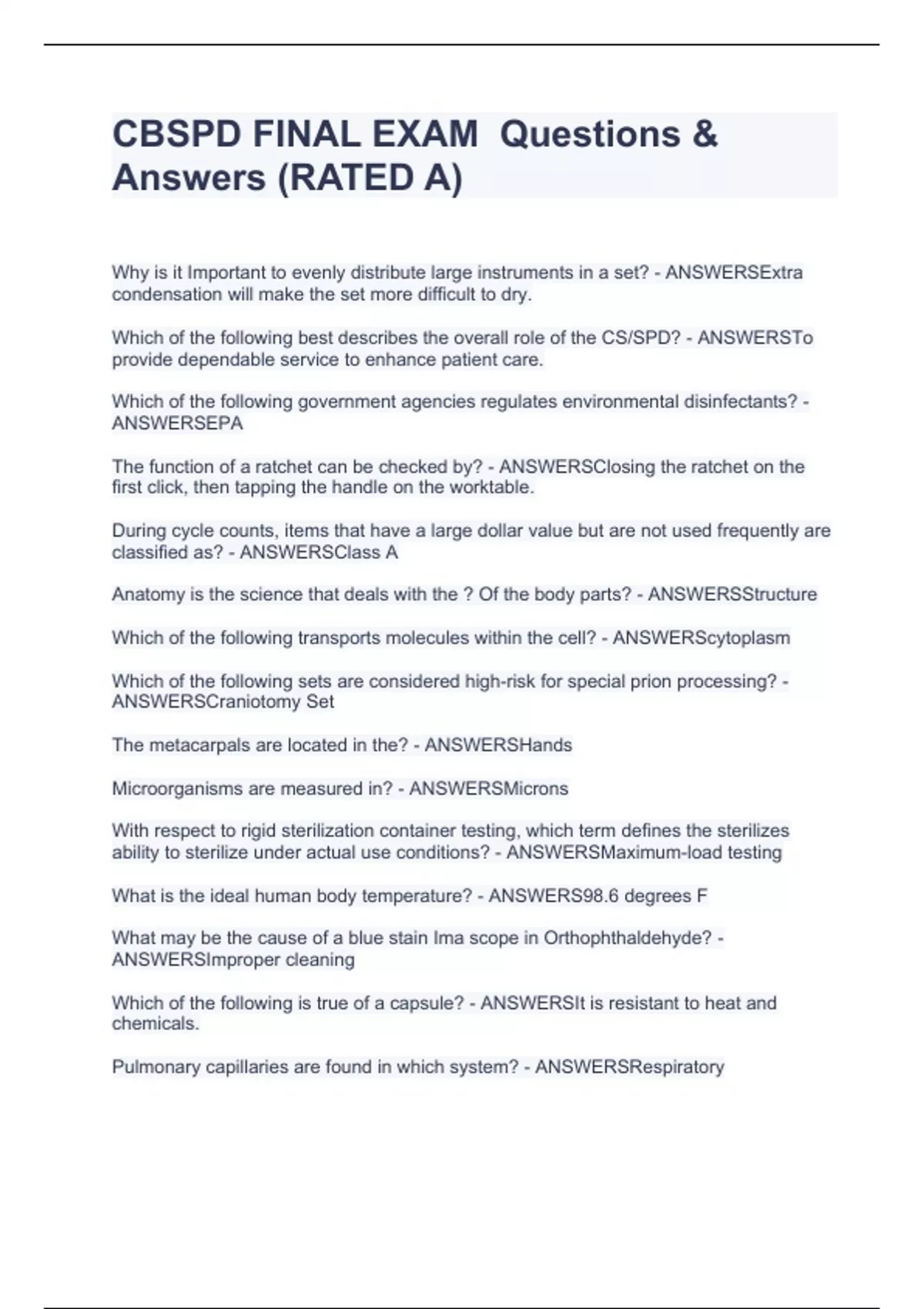 Why is it Important to evenly distribute large instruments in a set? - ANSWERSExtra condensation will make the set more difficult to dry. Which of the following best describes the overall role of the CS/SPD? - ANSWERSTo provide dependable service to enhance patient care. Which of the following government agencies regulates environmental disinfectants? - ANSWERSEPA The function of a ratchet can be checked by? - ANSWERSClosing the ratchet on the first click, then tapping the handle on the worktable. During cycle counts, items that have a large dollar value but are not used frequently are classified as? - ANSWERSClass A Anatomy is the science that deals with the ? Of the body parts? - ANSWERSStructure Which of the following transports molecules within the cell? - ANSWERScytoplasm Which of the following sets are considered high-risk for special prion processing? - ANSWERSCraniotomy Set