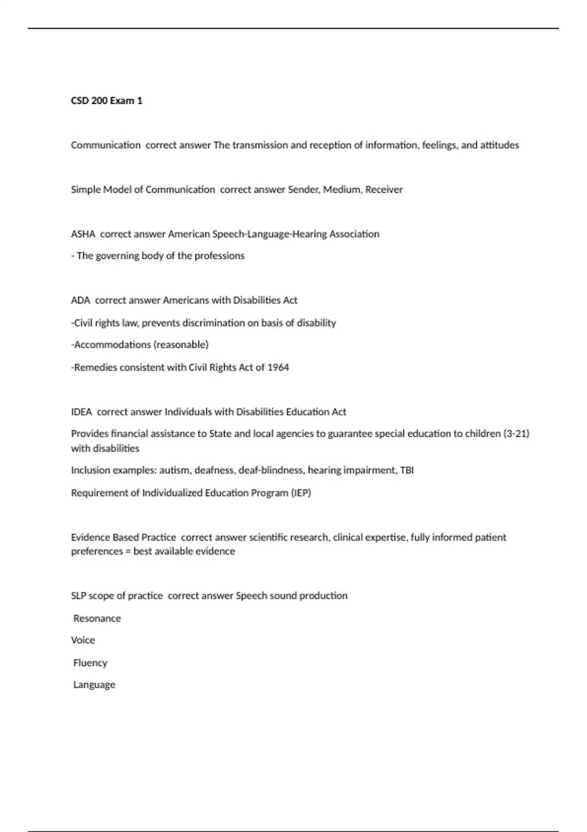 Communication correct answer The transmission and reception of information, feelings, and attitudes Simple Model of Communication correct answer Sender, Medium, Receiver ASHA correct answer American Speech-Language-Hearing Association - The governing body of the professions ADA correct answer Americans with Disabilities Act -Civil rights law, prevents discrimination on basis of disability -Accommodations (reasonable) -Remedies consistent with Civil Rights Act of 1964 IDEA correct answer Individuals with Disabilities Education Act Provides financial assistance to State and local agencies to guarantee special education to children (3-21) with disabilities Inclusion examples: autism, deafness, deaf-blindness, hearing impairment, TBI Requirement of Individualized Education Program (IEP) Evidence Based Practice correct answer scientific research, clinical expertise, fully informed patient preferences = best available evidence SLP scope of practice correct answer Speech sound production Resonance Voice Fluency Language
