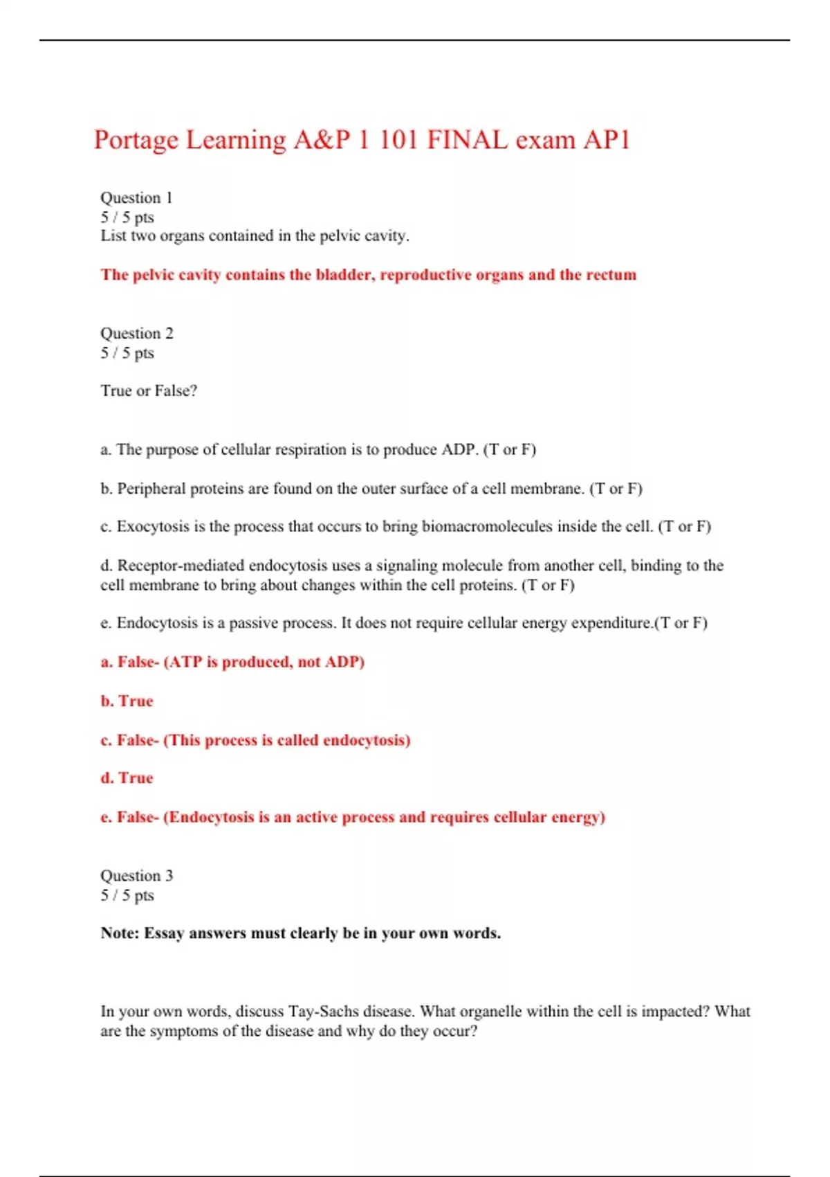 Portage Learning A&P 1 101 FINAL exam AP1 Question 1 5 / 5 pts List two organs contained in the pelvic cavity. The pelvic cavity contains the bladder, reproductive organs and the rectum Question 2 5 / 5 pts True or False? a. The purpose of cellular respiration is to produce ADP. (T or F) b. Peripheral proteins are found on the outer surface of a cell membrane. (T or F) c. Exocytosis is the process that occurs to bring biomacromolecules inside the cell. (T or F) d. Receptor-mediated endocytosis uses a signaling molecule from another cell, binding to the cell membrane to bring about changes within the cell proteins. (T or F) e. Endocytosis is a passive process. It does not require cellular energy expenditure.(T or F) a. False- (ATP is produced, not ADP) b. True c. False- (This process is called endocytosis) d. True e. False- (Endocytosis is an active process and requires cellular energy) Question 3 5 / 5 pts Note: Essay answers must clearly be in your own words. In your own words, discuss Tay-Sachs disease. What organelle within the cell is impacted? What are the symptoms of the disease and why do they occur? (1) Lysosomes (2) buildup of toxic lipids inside the cell (biomacromolecules) (3) disability and death In the genetic disease known as Tay-Sachs, one of the normally present digestive enzymes inside lysosomes is lacking. Thus, a toxic lipid in the brain cells cannot be broken down. The resulting buildup of lipids in these cells can cause intellectual disability and death. Question 4 5 / 5 pts Note: Essay answers must clearly be in your own words. You are observing two cells under the microscope. They are the same type of eukaryotic cell but one appears much larger. Based on appearance alone, which one would you expect to be carrying out respiration at a more active rate, the larger or smaller cell? Explain why. The smaller cell. Cells need to remain relatively small because as a cell expands the amount of surface area relative to the volume of the cell decreases. The smaller cell is more active because relative to its volume, its surface area is larger than a bigger cell. With a larger surface area (relative to its volume) this allows the metabolic processes to occur faster. Question 5 5 / 5 pts Note: Essay answers must clearly be in your own words. Explain what happens to the epiglottis during swallowing. Why? The trachea is closed by the epiglottis. The epiglottis moves inferiorly, covering the trachea. This is to prevent food or liquid from entering the lungs. Question 6 3 / 3 pts Air and food pass in which one of the following areas: Trachea Nasopharynx Correct! Oropharynx Alveoli Question 7 10 / 10 pts Label the following five items from the diagram: Label A- Label C- Label E- Label F- Label H- Your Answer: A-NASAL CAVITY Label A- Nasal Cavity Label C- Soft Palate/ Uvula Label E- Glottis Label F- Trachea Label H- Tongue Question 8 2 / 2 pts From widest to narrowest, the branches of the bronchial tree are: Correct! Primary bronchi, secondary bronchi, tertiary bronchi, bronchioles Bronchioles, primary bronchi, secondary bronchi, tertiary bronchi Tertiary bronchi, secondary bronchi, primary bronchi, bronchioles Secondary bronchi, tertiary bronchi, primary bronchi, bronchioles Question 9 5 / 5 pts Explain why a patient with liver disease would have intolerance to fatty foods. The liver produces bile which breaks down fats. If it is not producing bile (or less bile), fats will not be broken down effectively. Question 10 5 / 5 pts Look carefully at the diagram below. Label the following 5 organs of the digestive system. To receive credit for the intestines you must label the specific region. 1: 2: 5: 6: 8: : Liver 2: Pancreas 5: Duodenum (not small intestine) 6: Ileum (not small intestine) 8: Ascending colon (not large intestine) Question 11 10 / 10 pts Note: Essay answers must clearly be in your own words. Answer the following essay question: Describe parietal cells and chief cells: name their location, secretions and purposes. The parietal cells (located in the wall of the stomach body) secrete hydrochloric acid, generating a pH of 1.3-3.5. This very acidic pH kills many of the bacteria ingested along with food. In addition, the low pH stops the activity of salivary amylase. The secretion of hydrochloric acid is essential in the activation of pepsin. Chief cells: secrete pepsinogen. Pepsinogen (a pre-enzyme) is secreted by the chief cells in the stomach. Hydrochloric acid converts the inactive pepsinogen (secreted by the chief cells) into the active enzyme pepsin which begins the breakdown of proteins. Question 12 8 / 10 pts Label the following bones of the skeleton from the figure below: 1: 3: 5: 7: 8: 1: Frontal bone/frontal sinuses 3: Maxilla 5: Vomer 7: Maxilla 8: Mandible Question 13 5 / 5 pts Label the bones in the figure below: A: B: C: D: E: A: Pisiform B: Hamate C: Capitate D: Trapezoid E: Trapezium Question 14 5 / 5 pts (1) Osteoporosis is a bone tissue disease. When bone tissue degenerates faster than is replaced, the bones become weak. Brittle bones cause increased pain and are more likely to fracture. (2) They would have decreased osteoblasts which are responsible for bone repair. The bone repair would be unable to keep up with the ongoing breakdown of bone which is done by the work of osteoblasts. Question 15 10 / 10 pts Label the following five muscles: A: D: F: H: I: A: Frontalis/ occipitofrontalis D: Orbicularis Oris F: Zygomaticus minor H: Risorius I: Masseter Question 16 10 / 10 pts When flexor digitorum profundus contracts, what action(s) occurs? A. Wrist flexion B. Elbow flexion C. Flexion of digits 2-5 D. Flexion of digit 1 Correct! E. A&C F. B&C Question 17 5 / 5 pts Would you expect a female to have testosterone in their bloodstream? Explain why or why not. . (1) Yes. Both male and female bodies produce “all” the sex hormones. However, the ratios are different. (2) The adrenal glands are largely responsible for producing this “opposite” hormone that th