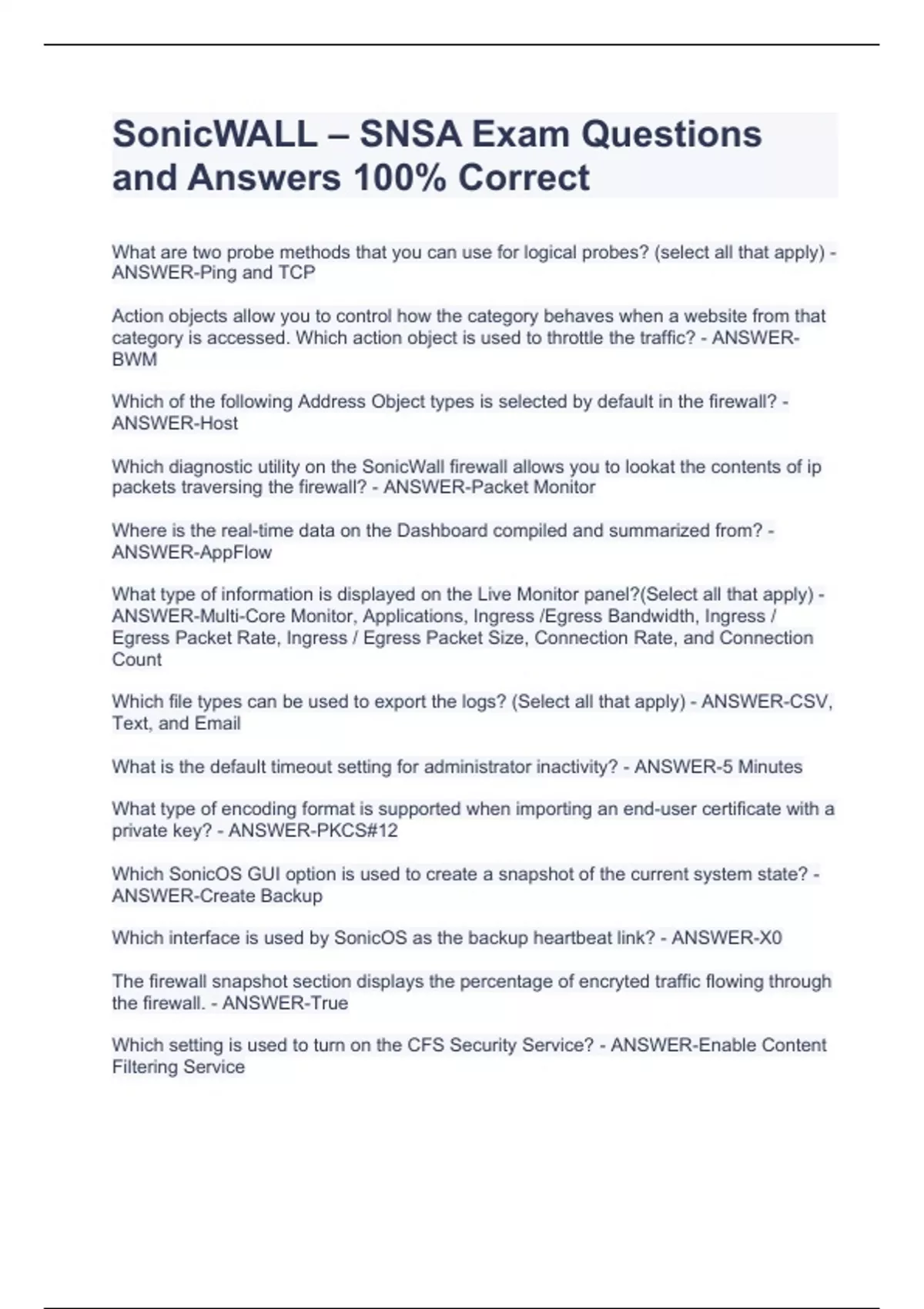 SonicWALL – SNSA Exam Questions and Answers 100% CorrectSonicWALL – SNSA Exam Questions and Answers 100% CorrectSonicWALL – SNSA Exam Questions and Answers 100% CorrectSonicWALL – SNSA Exam Questions and Answers 100% Correct What are two probe methods that you can use for logical probes? (select all that apply) - ANSWER-Ping and TCP Action objects allow you to control how the category behaves when a website from that category is accessed. Which action object is used to throttle the traffic? - ANSWER-BWM Which of the following Address Object types is selected by default in the firewall? - ANSWER-Host Which diagnostic utility on the SonicWall firewall allows you to lookat the contents of ip packets traversing the firewall? - ANSWER-Packet Monitor Where is the real-time data on the Dashboard compiled and summarized from? - ANSWER-AppFlow What type of information is displayed on the Live Monitor panel?(Select all that apply) - ANSWER-Multi-Core Monitor, Applications, Ingress /Egress Bandwidth, Ingress / Egress Packet Rate, Ingress / Egress Packet Size, Connection Rate, and Connection Count Which file types can be used to export the logs? (Select all that apply) - ANSWER-CSV, Text, and Email What is the default timeout setting for administrator inactivity? - ANSWER-5 Minutes What type of encoding format is supported when importing an end-user certificate with a private key? - ANSWER-PKCS#12 Which SonicOS GUI option is used to create a snapshot of the current system state? - ANSWER-Create Backup Which interface is used by SonicOS as the backup heartbeat link? - ANSWER-X0 The firewall snapshot section displays the percentage of encryted traffic flowing through the firewall. - ANSWER-True