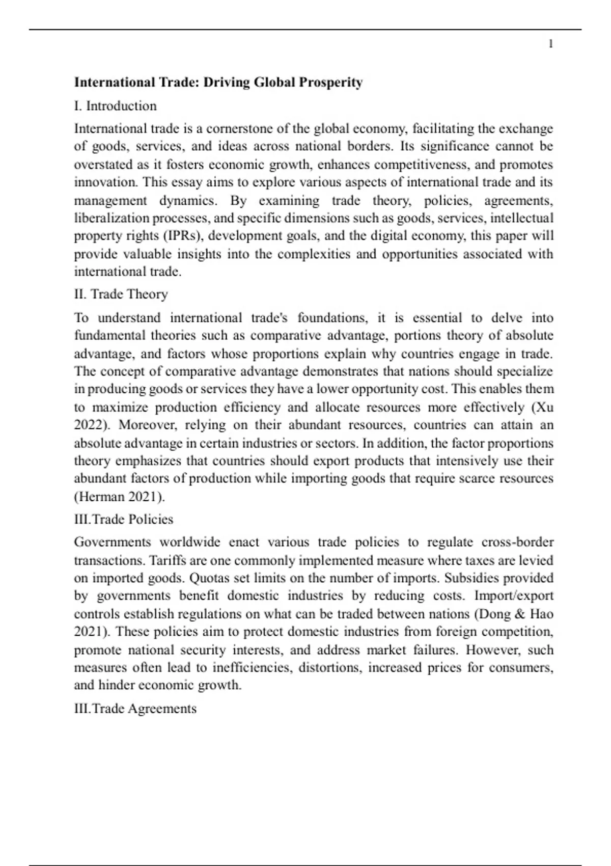 International trade is a cornerstone of the global economy, facilitating the exchange of goods, services, and ideas across national borders. Its significance cannot be overstated as it fosters economic growth, enhances competitiveness, and promotes innovation. This essay aims to explore various aspects of international trade and its management dynamics.