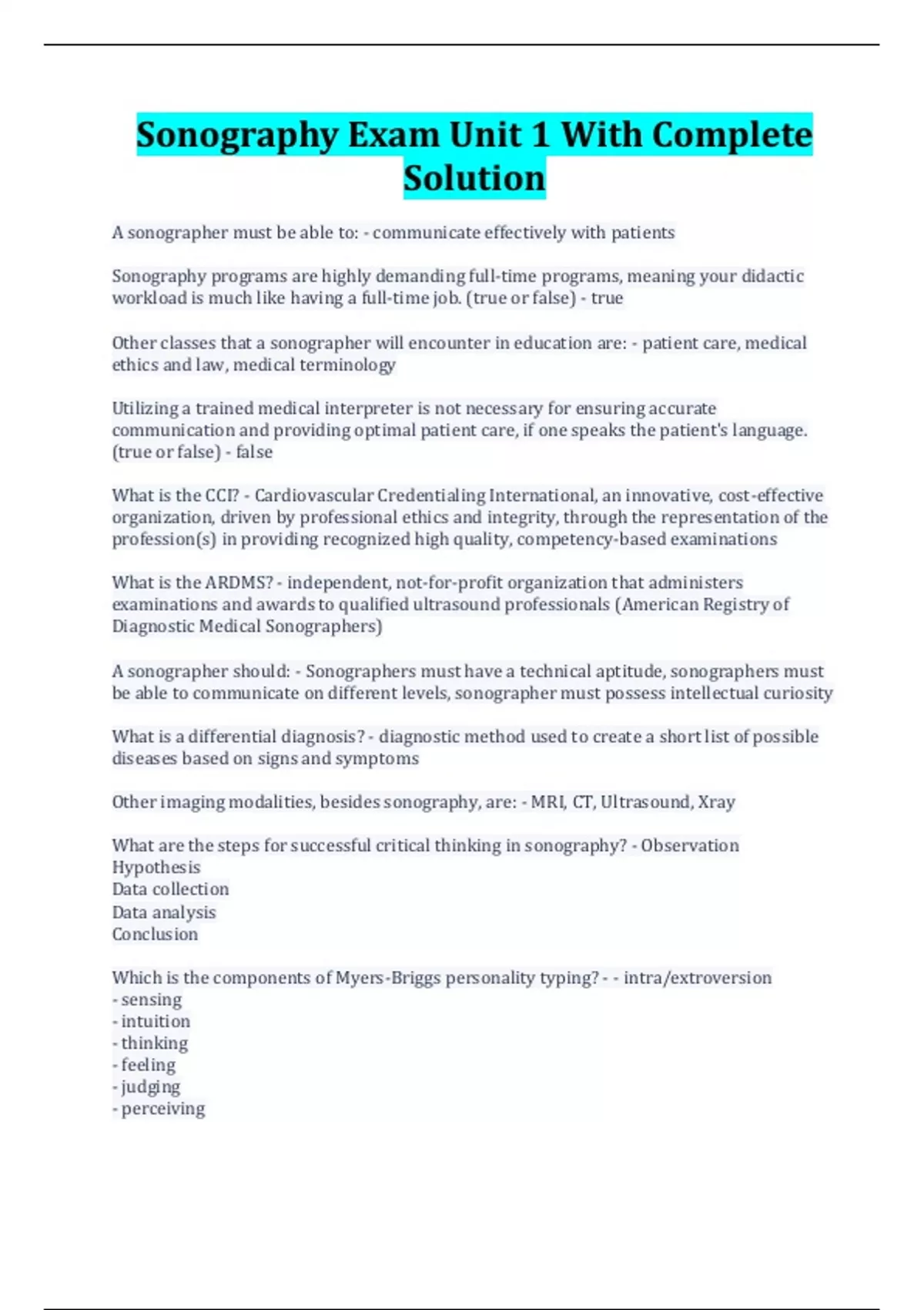 Sonography Exam Unit 1 With Complete Solution